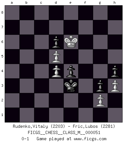 Last move : 0-1 2012 November 6 17:17:38 [Event "FICGS__CHESS__CLASS_M__000051"] [Site "FICGS"] [Date "2011.10.21"] [Round "1"] [White "Rudenko,Vitaly"] [Black "Fric,Lubos"] [Result "0-1"] [WhiteElo "2203"] [BlackElo "2281"] 1.e4 c5 2.Nf3 d6 3.d4 cxd4 4.Nxd4 Nf6 5.Nc3 a6 6.f3 e5 7.Nb3 Be6 8.Be3 Be7 9.Qd2 h5 10.O-O-O Nbd7 11.Kb1 b5 12.h3 Qc7 13.a3 Nb6 14.Bg5 Na4 15.Nd5 Bxd5 16.exd5 Rc8 17.c3 h4 18.Be2 Qd8 19.Be3 O-O 20.Rhe1 Re8 21.Qc2 Nh5 22.f4 Nxf4 23.Bxf4 exf4 24.Bg4 Ra8 25.Qf5 Bf6 26.Qxf4 Qc7 27.Qd2 Rab8 28.Nd4 Qc4 29.Bf3 Rxe1 30.Rxe1 b4 31.axb4 Bxd4 32.Qxd4 Qxd4 33.cxd4 Rxb4 34.Re8+ Kh7 35.Rc8 Rxb2+ 36.Kc1 a5 37.Rc6 Rb6 38.Rc4 Rb4 39.Rxb4 axb4 40.Kc2 Nc3 41.Kb3 f5 42.Kxb4 Ne4 43.Kb5 Kg6 44.Kc6 Kg5 45.Kd7 Kf4 46.Bd1 g5 47.Ke7 g4 48.Ke6 g3 49.Bc2 Ke3 50.Bxe4 fxe4 0-1 Sicilian : Najdorf Queenside Castling by player White (move 10) Kingside Castling by player Black (move 19) 10 pieces endgame at move 50 : White KPPPP , Black KPPPP WHITE : King + 4 Pawns BLACK : King + 4 Pawns Player Black won this chess game. Follow this game move after move (download)You may learn much more from a game you lose than from a game you win. You will have to lose hundreds of games before becoming a good player. (Jose Raul Capablanca) Verschiedene, sehr schätzbare und im Laufe des Lebens nützliche Eigenschaften des Geistes können durch das Schachspiel erworben und gekräftigt werden, so dass sie zu Gewohnheiten werden, die uns nie im Stich lassen. (Benjamin Franklin) Algunos sacrificios son sólidos, los demás son míos. (Mikhail Tal) On n'a jamais que l'âge auquel on a commence à jouer aux échecs car après on cesse de vieillir. (Capablanca) Train yourself to let go of everything you fear to lose. (Master Yoda in Star Wars ep.3)