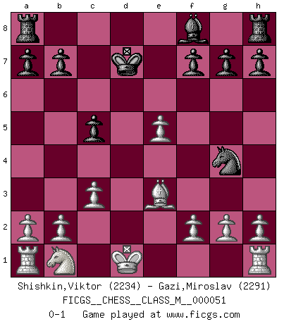 Last move : 0-1 2012 March 6 8:13:17 [Event "FICGS__CHESS__CLASS_M__000051"] [Site "FICGS"] [Date "2011.10.21"] [Round "1"] [White "Shishkin,Viktor"] [Black "Gazi,Miroslav"] [Result "0-1"] [WhiteElo "2234"] [BlackElo "2291"] 1.e4 c5 2.c3 d5 3.exd5 Qxd5 4.Nf3 Nf6 5.d4 Nc6 6.Be3 e5 7.Nxe5 Nxe5 8.dxe5 Qxd1+ 9.Kxd1 Ng4 10.Bb5+ Bd7 11.Bxd7+ Kxd7 0-1 This chess game has been lost on time (started : 2011.10.21 4:55:36) Sicilian : Alapin's variation (2.c3) Player Black won this chess game. Follow this game move after move (download)Chess is in its essence a game, in its form an art, and in its execution a science. (Baron Tassilo) Gewinnen beim Schach fördert das Selbstvertrauen. Beim Sex spüre ich sowas nicht... (Garry Kasparov) Aquel que ve no otra dirección en el juego que la de dar Jaque Mate a su oponente, nunca será un buen jugador de Ajedrez. (Euwe) Le jeu d'échecs fait naître et fortifie en nous plusieurs qualités précieuses dans le cours de l'existence, telles que la prévoyance, la circonspection, la prudence, et la persévérance. (Benjamin Franklin - 1783, la morale des échecs) The general who wins the battle makes many calculations in his temple before the battle is fought. The general who loses makes but few calculations beforehand. (Sun Tzu)