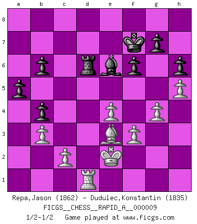 Last move : 1/2-1/2 2007 March 2 8:28:19 [Event "FICGS__CHESS__RAPID_A__000009"] [Site "FICGS"] [Date "2007.01.05"] [Round "1"] [White "Repa,Jason"] [Black "Dudulec,Konstantin"] [Result "1/2-1/2"] [WhiteElo "1862"] [BlackElo "1835"] 1.e4 e5 2.Nf3 Nc6 3.Bb5 a6 4.Bxc6 dxc6 5.O-O f6 6.d4 exd4 7.Nxd4 c5 8.Ne2 Qxd1 9.Rxd1 Bd7 10.Nbc3 Ne7 11.Be3 Ng6 12.Nd5 O-O-O 13.Nef4 Bd6 14.f3 Nxf4 15.Bxf4 Be6 16.Nb6+ cxb6 17.Bxd6 Rd7 18.Bg3 Rhd8 19.Rxd7 Rxd7 20.Bf4 b5 21.Kf2 b6 22.a3 Kd8 23.g4 Ke7 24.h4 a5 25.b3 b4 26.axb4 cxb4 27.h5 h6 28.Ke3 Kf7 29.Ke2 Rd8 30.Be3 Rd6 31.Rd1 1/2-1/2 Ruy Lopez : Exchange, Gligoric variation Kingside Castling by player White (move 5) Queenside Castling by player Black (move 12) This chess game ended in a draw. Follow this game move after move (download)A strong memory, concentration, imagination, and a strong will is required to become a great Chess player. (Bobby Fischer) Vielleicht wirkt die Aura früherer Spieler glanzvoller als die der heutigen Spieler, aber das liegt daran, dass man kein Programm wie Fritz hatte, das einem all die Löcher in ihren Partien zeigt. (Vladimir Kramnik) Bobby es el jugador de Ajedrez mas fino que este país jamás haya producido. Su memoria para las movidas, su brillantez en soñar combinaciones y su feróz determinación por la victoria son algo extraño. (John Collins) Mais n'est-ce pas déjà le limiter injurieusement que d'appeler les échecs un jeu? N'est-ce pas aussi une science, un art, ou quelque chose qui, comme le cercueil de Mahomet entre ciel et terre, est suspendu entre l'un et l'autre, et qui réunit un nombre incroyable de contraires ? (Stefan Zweig) Optimism is a variety of information deficit. Sometimes especially true for correspondence chess games. (Michael Aigner)