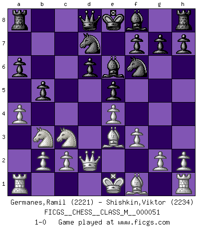 Last move : 1-0 2011 December 2 15:3:0 [Event "FICGS__CHESS__CLASS_M__000051"] [Site "FICGS"] [Date "2011.10.21"] [Round "1"] [White "Germanes,Ramil"] [Black "Shishkin,Viktor"] [Result "1-0"] [WhiteElo "2221"] [BlackElo "2234"] 1.e4 c5 2.Nf3 d6 3.d4 cxd4 4.Nxd4 Nf6 5.Nc3 a6 6.Be3 e5 7.Nb3 Be6 8.f3 Nbd7 9.Qd2 b5 10.a4 1-0 This chess game has been lost on time (started : 2011.10.21 4:55:36) Sicilian : Najdorf, Byrne (English) attack Player White won this chess game. Follow this game move after move (download)Bobby just drops the pieces and they fall on the right squares. (Miguel Najdorf) Garry Kasparov war erst in der Großmeister-Organisation GMA, dann in der Profischach-Vereinigung PCA, zum Schluss kehrte er wieder in den Schoß der FIDE zurück. Aber gut, manche Leute sind flexibel (Viswanathan Anand) Los problemas de Ajedrez exigen del compositor las mismas virtudes que caracterizan todo el arte de valor: originalidad, invención, concisión, armonía, complejidad e insinceridad explendida. (Vladimir Nabokov) Plusieurs personnes se sont demandées comment Tal faisait pour gagner... En fait, c'est très simple ! Il met ses pièces au centre de l'échiquier et les sacrifie quelque part ! (David Bronstein) Work expands to fill the time available. (C. Northcote Parkinson, in Parkinson's Laws)