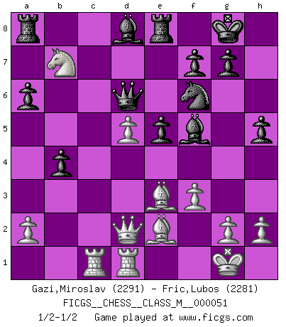 Last move : 1/2-1/2 2012 October 14 23:45:42 [Event "FICGS__CHESS__CLASS_M__000051"] [Site "FICGS"] [Date "2011.10.21"] [Round "1"] [White "Gazi,Miroslav"] [Black "Fric,Lubos"] [Result "1/2-1/2"] [WhiteElo "2291"] [BlackElo "2281"] 1.e4 c5 2.Nf3 d6 3.d4 cxd4 4.Nxd4 Nf6 5.Nc3 a6 6.Be3 e5 7.Nb3 Be6 8.f3 Be7 9.Qd2 h5 10.Nd5 Nxd5 11.exd5 Bf5 12.Be2 Nd7 13.O-O O-O 14.Na5 Qc7 15.c4 Rfe8 16.Rac1 Nf6 17.b4 Qd7 18.Rfd1 Bd8 19.c5 dxc5 20.Nb3 cxb4 21.Nc5 Qd6 22.Nxb7 Qd7 23.Nc5 Qd6 24.Nb7 1/2-1/2 Sicilian : Najdorf, Byrne (English) attack Kingside Castling by player White (move 13) Kingside Castling by player Black (move 13) This chess game ended in a draw. Follow this game move after move (download)You can only get good at Chess if you love the game. (Bobby Fischer) Als ich elf wurde, wurde ich einfach gut. (Robert James Fischer) El Ajedrez, como la música, como el amor, tiene el poder de hacer feliz a la gente. (Siegbert Tarrasch) Aux échecs, l'amour-propre est satisfait quand on remporte la victoire, mais il n'y a pas de honte à être battu. (Benjamin Franklin) Tree pose grows confidence. It roots me to this world. (Terri Guillemets)