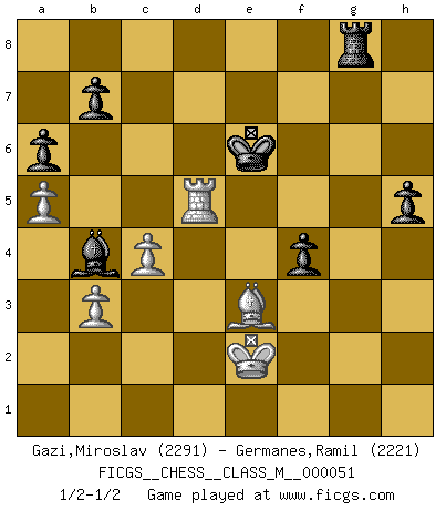 Last move : 1/2-1/2 2012 October 27 13:36:15 [Event "FICGS__CHESS__CLASS_M__000051"] [Site "FICGS"] [Date "2011.10.21"] [Round "1"] [White "Gazi,Miroslav"] [Black "Germanes,Ramil"] [Result "1/2-1/2"] [WhiteElo "2291"] [BlackElo "2221"] 1.e4 c5 2.Nf3 d6 3.d4 cxd4 4.Nxd4 Nf6 5.Nc3 a6 6.Be3 e5 7.Nb3 Be6 8.f3 h5 9.Be2 Nbd7 10.a4 Nb6 11.a5 Nc4 12.Bxc4 Bxc4 13.Bb6 Qd7 14.Nd2 Be6 15.Nf1 d5 16.exd5 Nxd5 17.Nxd5 Qxd5 18.Qxd5 Bxd5 19.b3 f6 20.Ne3 Bc6 21.Rd1 Kf7 22.h4 Re8 23.Kf2 Re6 24.c4 Bd6 25.g3 Rc8 26.Rhf1 Bf8 27.Rd2 Rd6 28.Rxd6 Bxd6 29.Rd1 Ke6 30.Nf5 Bf8 31.Ne3 Bb4 32.Nd5 Bxd5 33.Rxd5 g6 34.Ke2 Rg8 35.Be3 g5 36.hxg5 fxg5 37.f4 gxf4 38.gxf4 exf4 1/2-1/2 Sicilian : Najdorf, Byrne (English) attack This chess game ended in a draw. Follow this game move after move (download)Chess is a beautiful mistress. (Bent Larsen) Man gibt nur Pakete auf. (Paul Keres) Aquellos que dicen que entienden al Ajedrez, no entienden nada. (Robert Hubner) Mon pion favori sur ma case favorite ! Bronstein en parlant d'un coup de pion en h5 quand il avait les Noirs. The message for business people contemplating their place in the cyberspace is simple and direct: get linked or get lost. (Vic Sussman and Kenan Pollack)
