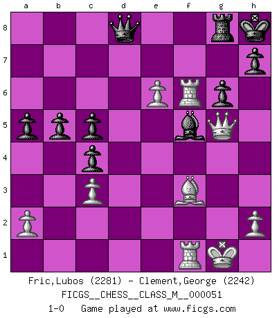 Last move : 1-0 2012 May 1 21:22:26 [Event "FICGS__CHESS__CLASS_M__000051"] [Site "FICGS"] [Date "2011.10.21"] [Round "1"] [White "Fric,Lubos"] [Black "Clement,George"] [Result "1-0"] [WhiteElo "2281"] [BlackElo "2242"] 1.Nf3 d5 2.d4 Nf6 3.c4 e6 4.g3 dxc4 5.Bg2 a6 6.O-O Nc6 7.e3 Bd7 8.Qe2 Bd6 9.Nc3 b5 10.e4 e5 11.dxe5 Nxe5 12.Nxe5 Bxe5 13.f4 Bxc3 14.bxc3 c6 15.f5 O-O 16.g4 Re8 17.g5 Nd5 18.Qf3 Nb6 19.Bf4 Na4 20.Rad1 Nc5 21.Rd4 Nd3 22.Qg3 Qc8 23.Be3 c5 24.Rd6 Ra7 25.Qh4 Ne5 26.Bf4 a5 27.Bxe5 Rxe5 28.g6 fxg6 29.f6 gxf6 30.Rdxf6 Re7 31.Qf4 Ra8 32.e5 Bf5 33.Qg5 Rg7 34.Bd5+ Kh8 35.Bxa8 Qd8 36.e6 Rg8 37.Bf3 1-0 Reti Opening Kingside Castling by player White (move 6) Kingside Castling by player Black (move 15) Player White won this chess game. Follow this game move after move (download)I like the moment when I break a man's ego. (Bobby Fischer) Wenn Du nicht kämpfst, um anderen etwas zu beweisen, sondern nur für Dich selbst, dann bist du fast unbesiegbar. (Garry Kasparov) El Ajedrez es un regaderazo frío para la mente. (Sir John Simon) Les échecs sont utiles à l'exercice de la faculté de penser et à celle de l'imagination. Car nous devons posséder une méthode élaborée pour atteindre des buts partout où nous devons conduire notre raison. (Leibnitz) Nobody is always a winner, and anybody who says he is, is either a liar or doesn't play poker. (Amarillo Slim)