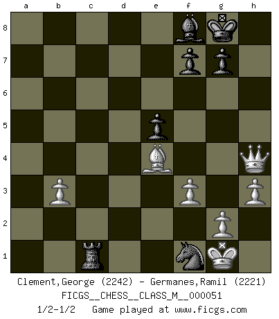 Last move : 1/2-1/2 2012 March 5 14:18:47 [Event "FICGS__CHESS__CLASS_M__000051"] [Site "FICGS"] [Date "2011.10.21"] [Round "1"] [White "Clement,George"] [Black "Germanes,Ramil"] [Result "1/2-1/2"] [WhiteElo "2242"] [BlackElo "2221"] 1.e4 c5 2.Nf3 d6 3.d4 cxd4 4.Nxd4 Nf6 5.Nc3 a6 6.f3 e5 7.Nb3 Be6 8.Be3 Be7 9.Qd2 h5 10.Nd5 Nxd5 11.exd5 Bf5 12.Be2 Nd7 13.O-O O-O 14.Na5 Qc7 15.c4 h4 16.b4 Nf6 17.h3 Bd7 18.Nb3 Ba4 19.Rac1 b6 20.Bd3 a5 21.bxa5 bxa5 22.Qf2 Nh5 23.c5 Bxb3 24.axb3 dxc5 25.Rfd1 Ng3 26.Bxc5 Rfc8 27.Ba3 Bxa3 28.Rxc7 Rxc7 29.Kh2 Rb8 30.d6 Bxd6 31.Be4 Rbc8 32.Qd2 Ba3 33.Qxa5 Rc1 34.Rxc1 Rxc1 35.Qd8+ Bf8 36.Qxh4 Nf1+ 37.Kg1 1/2-1/2 Sicilian : Najdorf Kingside Castling by player White (move 13) Kingside Castling by player Black (move 13) This chess game ended in a draw. Follow this game move after move (download)Human affairs are like a Chess game: only those who do not take it seriously can be called good players. (Hung Tzu Ch'eng) Die unerbitterlichsten Regeln im Schach sind die Ausnahmen. (Savielly Grigorievitsch Tartakower) Una victoria por una combinación errónea, aunque sea espectacular, me llena de horror artístico. (Wilhelm Steinitz) La tactique est l'élément le plus important du milieu de jeu. (Siegbert Tarrasch) Ah, beer! The cause of, and the solution to, all of life's problems. (Homer Simpson)