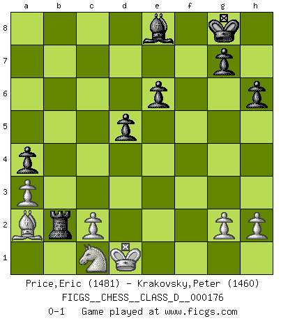 Last move : 0-1 2012 January 30 23:27:38 [Event "FICGS__CHESS__CLASS_D__000176"] [Site "FICGS"] [Date "2011.10.22"] [Round "1"] [White "Price,Eric"] [Black "Krakovsky,Peter"] [Result "0-1"] [WhiteElo "1481"] [BlackElo "1460"] 1.e4 c5 2.Nf3 d6 3.d4 cxd4 4.Nxd4 Nf6 5.Nc3 a6 6.Bg5 e6 7.Qd2 Nc6 8.O-O-O Bd7 9.Kb1 h6 10.Bh4 Nxe4 11.Bxd8 Nxd2+ 12.Rxd2 Rxd8 13.Bc4 Nxd4 14.Rxd4 d5 15.Bb3 Bc5 16.Rd2 O-O 17.Rhd1 Bb4 18.Rd3 Be7 19.f4 b5 20.f5 b4 21.fxe6 fxe6 22.Ne2 a5 23.a4 bxa3 24.bxa3 a4 25.Ba2 Rb8+ 26.Kc1 Bg5+ 27.R3d2 Bxd2+ 28.Rxd2 Rf1+ 29.Rd1 Rxd1+ 30.Kxd1 Rb2 31.Nc1 Be8 0-1 Sicilian : Najdorf, 6...e6 Queenside Castling by player White (move 8) Kingside Castling by player Black (move 16) Player Black won this chess game. Follow this game move after move (download)Chess is a fighting game which is purely intellectual and includes chance. (Richard Reti) Wer sich die Fähigkeit anerziehen will im Schach selbstständig zu denken, der muß alles meiden, was leblos ist: ausgeklügelte Theorien, die sich auf sehr wenige Beispiele und eine Menge Hirngespinste stützen. (Emanuel Lasker) Cuando no sepas que mover, espera por una idea que se le venga a la la cabeza de tu oponente. Tenlo por seguro de que esa idea estará incorrecta. (Siegbert Tarrasch) Des idées, des idées, j'en ai cent, j'en ai mille. Des bonnes, des mauvaises, applicables, irréalisables... Il suffit de faire le tri ! (Roos) If you lose the game you should win the analysis! (Proverb)