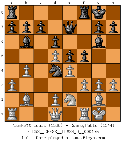 Last move : 1-0 2012 February 13 19:24:9 [Event "FICGS__CHESS__CLASS_D__000176"] [Site "FICGS"] [Date "2011.10.22"] [Round "1"] [White "Plunkett,Louis"] [Black "Ruano,Pablo"] [Result "1-0"] [WhiteElo "1586"] [BlackElo "1544"] 1.c4 e5 2.g3 Nf6 3.Bg2 Bc5 4.Nc3 O-O 5.a3 Nc6 6.e3 d6 7.b4 Bb6 8.Nge2 Bg4 9.h3 Bf5 10.e4 Bg6 11.O-O Nd4 12.Bb2 Qe7 13.Nd5 Nxd5 14.cxd5 f5 15.f3 1-0 This chess game has been lost on time (started : 2011.10.22 17:15:6) English Opening Kingside Castling by player Black (move 4) Kingside Castling by player White (move 11) Player White won this chess game. Follow this game move after move (download)I know people who have all the will in the world, but still can't play good Chess. (Bobby Fischer) Ich war zu klein für die Schach-Schülermannschaft! (Woody Allen) Debemos de asegurarnos de que el Ajedrez no se convierta en un lenguaje muerto, muy interesante, pero solo para un grupo muy pequeño. (Sytze Faber) Toutes choses étant égales, c'est la conviction qui gagne. Alliée à une volonté de vaincre, elle sert de détonateur, suscite des idées, disperse les doutes et aide à penser clairement. (Robert Fischer) May the force be with you. (Han Solo in Star Wars ep.4)