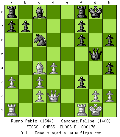 Last move : 0-1 2012 January 28 18:35:34 [Event "FICGS__CHESS__CLASS_D__000176"] [Site "FICGS"] [Date "2011.10.22"] [Round "1"] [White "Ruano,Pablo"] [Black "Sanchez,Felipe"] [Result "0-1"] [WhiteElo "1544"] [BlackElo "1400"] 1.d4 d5 2.Nc3 Nf6 3.Bg5 h6 4.Bxf6 exf6 5.Nf3 Bb4 6.e3 O-O 7.Bd3 c5 8.a3 Bxc3+ 9.bxc3 c4 10.Be2 Qa5 11.Qd2 Nc6 12.e4 dxe4 13.Nh4 g5 14.Bxc4 gxh4 15.O-O Qg5 16.f4 exf3 0-1 This chess game has been lost on time (started : 2011.10.22 17:15:6) Richter-Veresov attack Kingside Castling by player Black (move 6) Kingside Castling by player White (move 15) Player Black won this chess game. Follow this game move after move (download)There are two types of sacrifices: correct ones and mine. (Mikhail Tal) Wenn ich gewinne bin ich ein Genie. Wenn nicht, dann bin ich keines. (Robert James Fischer) Siempre es mejor sacrificar los hombres de tu oponente. (Savielly Tartakower) On croit qu'il y a plus de mauvais joueurs que de bons joueurs, c'est faux : Il y a autant de joueurs qui gagnent que de joueurs qui perdent. (Philippe Geluck) If everyone is thinking alike, then somebody isn't thinking. (US General George S. Patton)