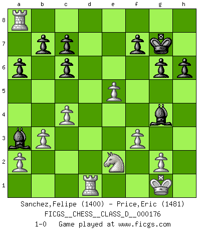 Last move : 1-0 2012 January 9 16:57:32 [Event "FICGS__CHESS__CLASS_D__000176"] [Site "FICGS"] [Date "2011.10.22"] [Round "1"] [White "Sanchez,Felipe"] [Black "Price,Eric"] [Result "1-0"] [WhiteElo "1400"] [BlackElo "1481"] 1.e4 e5 2.Nf3 Nc6 3.Bb5 Nf6 4.O-O a6 5.Bxc6 dxc6 6.d3 Bd6 7.b3 O-O 8.c4 Re8 9.h3 h6 10.Nc3 Bf8 11.Bb2 g6 12.Ne2 Bg7 13.Bxe5 Rxe5 14.Nxe5 Nxe4 15.dxe4 Qxd1 16.Raxd1 Bxe5 17.Rd8+ Kg7 18.Re8 Bd6 19.e5 Ba3 20.Rd1 Bxh3 21.Rxa8 Bg4 22.f3 1-0 Ruy Lopez : Berlin defense, 4.O-O Kingside Castling by player White (move 4) Kingside Castling by player Black (move 7) Player White won this chess game. Follow this game move after move (download)You know you're going to lose. Even when I was ahead I knew I was going to lose. - On playing against Fischer. (Andrew Soltis) Privat ist Kortschnoi kein schlechter Mensch, sehr sympathisch. Aber während des Spiels ist er grausam. Er will dich töten. (Miguel Najdorf) EL Ajedrez es como la vida. (Boris Spassky) Echiquier : carré parfait, comme la Jérusalem nouvelle décrite par l'auteur de l'Apocalypse, huit cases sur huit, exaltation du chiffre 4, symbole du cosmos aux quatre horizons... où le noir et le blanc, l'ombre et la lumière, le mal et le bien s'entremêlent et se conjuguent. (Robert Couffignal, Le Gambit du poète) If things go wrong, don't go with them. (Roger Babson)