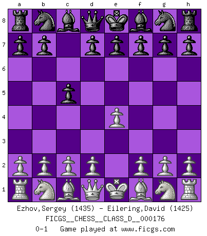 Last move : 0-1 2011 December 3 15:20:45 [Event "FICGS__CHESS__CLASS_D__000176"] [Site "FICGS"] [Date "2011.10.22"] [Round "1"] [White "Ezhov,Sergey"] [Black "Eilering,David"] [Result "0-1"] [WhiteElo "1435"] [BlackElo "1425"] 1.e4 c5 0-1 This chess game has been lost on time (started : 2011.10.22 17:15:6) Sicilian defense Player Black won this chess game. Follow this game move after move (download)Those who say they understand Chess, understand nothing. (Robert Hubner) Besser ein falscher Plan, logisch durchgeführt, als gar kein Plan. (Viktor Kortschnoi) La partida mas dura de ganar es una partida ganada. (Emanuel Lasker) Une platitude souvent récitée à propos des Echecs est qu'une des choses les plus difficiles à réaliser est de gagner une position gagnante. Cela ne manque pas de sens mais, pour ma part, j'ai toujours trouvé plus difficile de gagner une position perdante. (Tim Krabbe) I feel so... helpless. (C-3PO in Star Wars ep.3)