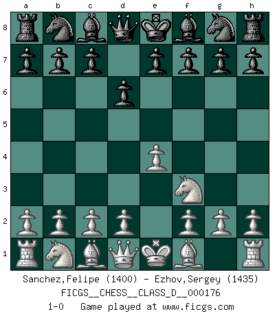 Last move : 1-0 2011 December 3 3:19:0 [Event "FICGS__CHESS__CLASS_D__000176"] [Site "FICGS"] [Date "2011.10.22"] [Round "1"] [White "Sanchez,Felipe"] [Black "Ezhov,Sergey"] [Result "1-0"] [WhiteElo "1400"] [BlackElo "1435"] 1.e4 d6 2.Nf3 1-0 This chess game has been lost on time (started : 2011.10.22 17:15:6) King's pawn Opening Player White won this chess game. Follow this game move after move (download)Strategy requires thought, tactics require observation. (Max Euwe) Es liegt in der Natur, vernüftig zu denken und unlogisch zu handeln. (Anatole France) El Ajedrez es un invernadero donde los frutos del carácter pueden madurar mas completamente que en la vida. (Edward Morgan Foster) Dieu déplace le joueur, et celui-ci la pièce. Quel Dieu derrière Dieu commence donc la trame ? Arturo Perez-Reverte (prix de littérature policière 1993). Life doesn't imitate art, it imitates bad television. (Woody Allen)