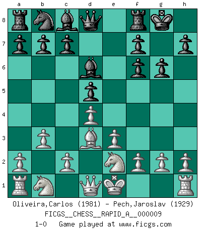 Last move : 1-0 2007 March 3 12:24:29 [Event "FICGS__CHESS__RAPID_A__000009"] [Site "FICGS"] [Date "2007.01.05"] [Round "1"] [White "Oliveira,Carlos"] [Black "Pech,Jaroslav"] [Result "1-0"] [WhiteElo "1981"] [BlackElo "1929"] 1.b3 d5 2.Bb2 Nf6 3.e3 g6 4.Bxf6 exf6 5.d4 Bd6 6.Bd3 O-O 7.Ne2 1-0 This chess game has been lost on time (started : 2007.01.05 11:50:5) Nimzovich-Larsen attack : Classical variation Kingside Castling by player Black (move 6) Player White won this chess game. Follow this game move after move (download)Chess is a beautiful mistress. (Bent Larsen) Im Hotelzimmer gab es nur zwei Schaben. (Über die Turnierbedingungen) (Peter Swidler) Cuando la partida de Ajedrez termina, el Peón y el Rey regresan a la misma caja. (Irish saying) Nous vivons dans un monde échiquéen : chaque jour qui passe est un défi à relever. (Philosophe Sasha) The difference between perseverance and obstinacy is that one comes from a strong will, and the other from a strong won't. (Henry Ward Beecher)