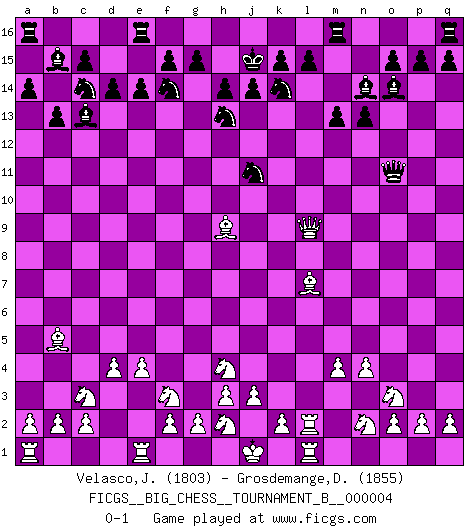 Last move : 0-1 2012 February 7 19:9:59 [Event "FICGS__BIG_CHESS__TOURNAMENT_B__000004"] [Site "FICGS"] [Date "2011.10.23"] [Round "1"] [White "Velasco,Jose Maria"] [Black "Grosdemange,David"] [Result "0-1"] [WhiteElo "1803"] [BlackElo "1855"] 1.j2-h4 j15-h13 2.h1-o7 m15-m13 3.e2-e4 b16-c14 4.f1-b5 p16-o14 5.d2-d4 k16-l14 6.c1-o12 n15-n13 7.o12-p11 h16-n11 8.p11-o10 n11-l11 9.b1-c3 l11-l2 10.k1-l3 l2-b11 11.m2-m4 l16-n14 12.n2-n4 g16-f14 13.o1-f9 l14-j13 14.l1-o4 o16-f8 15.p1-o3 e15-e14 16.o7-p8 f8-n15 17.o10-p11 j13-l12 18.o4-l7 b15-b14 19.f9-e8 b11-j11 20.p8-n10 f16-c13 21.g1-f3 c16-b15 22.n10-p10 o14-n12 23.p11-m8 j11-n11 24.m1-l1 n15-o14 25.l1-l2 d15-d14 26.e8-a12 a15-a14 27.q1-l1 n12-m10 28.m8-l9 n11-o11 29.p10-p7 m10-n8 30.p7-n9 n8-l9 31.n9-l9 b14-b13 32.a12-f7 h15-k14 33.l3-n2 j16-j15 34.f7-h9 l12-j11 0-1 This big chess game has been lost on time (started : 2011.10.23 15:34:24) Follow this game move after move (download)The sign of a great Master is his ability to win a won game quickly and painlessly. (Irving Chernev) Drei Punkte vor allen anderen ist wie einer, der im weißen Anzug posiert, während der Rest in Müllsäcke gekleidet dasteht. (Viktor Kortschnoi) En un gambito tu regalas un Peón por el bién de tomar un juego perdido. (Samuel Standige Boden) Pour moi, les échecs ne sont pas un jeu mais un art. (Alexandre Alekhine) You think that education is too expensive ? Try ignorance. (Derek Bok)