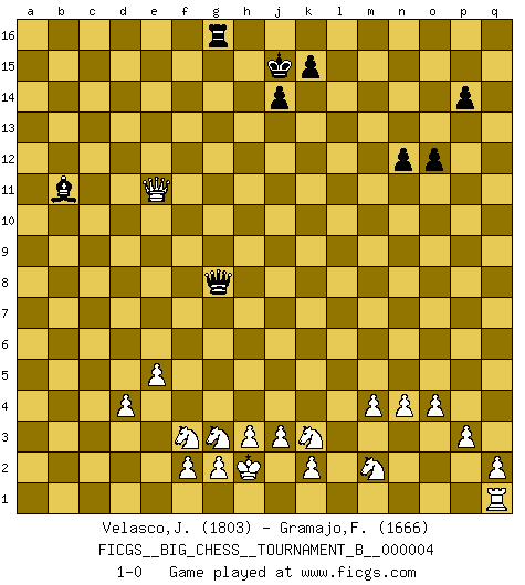 Last move : 1-0 2011 November 3 23:15:41 [Event "FICGS__BIG_CHESS__TOURNAMENT_B__000004"] [Site "FICGS"] [Date "2011.10.23"] [Round "1"] [White "Velasco,Jose Maria"] [Black "Gramajo,Francisco"] [Result "1-0"] [WhiteElo "1803"] [BlackElo "1666"] 1.j2-h4 d15-d13 2.h1-o7 e15-e13 3.o7-f15 g16-f14 4.f15-o7 p16-o14 5.m2-m4 a15-a13 6.l1-p5 a13-a12 7.n2-n4 n15-n13 8.o1-d11 e13-e12 9.d11-g8 m15-m13 10.e2-e4 a12-a11 11.f1-c4 a11-a10 12.d2-d4 f16-a11 13.g1-f3 b16-c14 14.c1-k8 c14-e13 15.o7-l10 j15-k13 16.p1-o3 p15-p14 17.l10-n10 o14-n12 18.k8-n11 m13-m12 19.n11-l9 e13-g12 20.n10-n12 o15-o14 21.b1-c3 g12-j11 22.n12-o11 o14-o13 23.l9-j11 k13-j11 24.p5-j11 f14-h13 25.j11-p5 n13-n12 26.o11-j6 m16-m14 27.g8-k11 h16-l13 28.p5-j11 h13-j11 29.k11-e16 c16-l8 30.j6-b13 c15-c14 31.e16-c14 b15-c14 32.b13-b15 a16-g16 33.b15-b11 a11-e7 34.b11-a10 o16-q14 35.c4-d5 l8-f3 36.h2-f3 l13-l2 37.o3-m2 q14-h6 38.a10-e10 h6-f8 39.h4-k3 l2-l11 40.m1-l1 l11-j13 41.l1-l4 m14-k14 42.l4-j4 q16-m16 43.e10-q10 j13-p7 44.q10-l15 k16-l14 45.p2-p3 e7-d8 46.l15-q15 f8-m2 47.k1-m2 p7-o8 48.o2-o4 o13-o12 49.q15-q4 j11-k9 50.d5-j10 k9-l7 51.j10-e14 g16-f16 52.q4-e15 l16-q11 53.j4-j5 d8-e9 54.j5-o5 o8-g8 55.o5-g5 e9-g7 56.e15-n7 l7-j6 57.g5-g6 g8-b8 58.e4-e5 q11-k5 59.g6-g7 j6-g7 60.n7-g7 b8-b2 61.c3-e2 b2-c2 62.g7-g15 j16-j15 63.a1-c1 c2-a2 64.c1-c14 l14-j13 65.e14-d13 a2-e6 66.g15-h14 j15-h16 67.c14-c15 k5-d11 68.e1-a1 m16-j16 69.a1-a15 e12-e11 70.h14-g15 h16-j15 71.g15-g13 j15-h16 72.g13-e13 h16-j15 73.e13-j13 k14-k13 74.j13-m10 k13-d13 75.m10-m12 j15-h14 76.c15-c14 d11-g14 77.m12-k12 d13-j13 78.a15-h15 h14-h15 79.k12-j13 e6-g8 80.c14-c15 f16-f15 81.c15-f15 g14-f15 82.j1-h2 j16-g16 83.e2-g3 f15-b11 84.j13-h12 h15-j15 85.h12-f12 j15-j16 86.f12-e12 j16-h16 87.e12-d12 h16-j15 88.d12-e11 1-0 Follow this game move after move (download)The boy (then a 12 year old boy named Anatoly Karpov) doesn't have a clue about Chess, and there's no future at all for him in this profession. (Mikhail Botvinnik) Ihnen, Herr Lasker, habe ich nur drei Worte zu sagen: Schach und matt. (Siegbert Tarrasch) El Ajedrez es tan inspirador que yo no creo que un buen jugador sea capaz de tener un pensamiento malo durante una partida. (Wilhelm Steinitz) Votre prénom est 'Tactique', votre deuxième prénom est 'Tactique' et votre nom est 'Tactique'. (Ken Smith) I think your argument is specious - I think your tie is ugly. (Gregory House to Dr. Foreman, House M.D.)