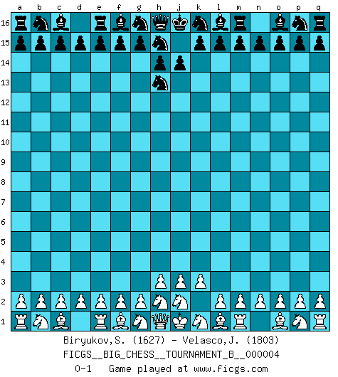 Last move : 0-1 2011 November 24 1:29:58 [Event "FICGS__BIG_CHESS__TOURNAMENT_B__000004"] [Site "FICGS"] [Date "2011.10.23"] [Round "1"] [White "Biryukov,Sergey"] [Black "Velasco,Jose Maria"] [Result "0-1"] [WhiteElo "1627"] [BlackElo "1803"] 1.k2-k3 j15-h13 0-1 This big chess game has been lost on time (started : 2011.10.23 15:34:24) Follow this game move after move (download)To avoid losing a piece, many a person has lost the game. (Savielly Tartakover) Du musst Deinen Gegner in einen tiefen dunklen Wald führen wo 2+2=5 ist und wo der Weg, der wieder hinausführt, nur breit genug für einen ist. (Mikhail Nekhemyevich Tal) Con el fin de mejorar tu juego, debes de estudiar los finales antes que todo, ya que mientras que los finales pueden ser estudiados y dominados por sí mismos, el juegomedio y la apertura deben de ser estudiados en relación con los finales. (José Raúl Capablanca) Il n'y a plus de joueurs du niveau de Jacob Murray dont la seule quête est le beau jeu, le plaisir de voir les pièces construire quelque chose. Sur 10 idées à la minute, 9 seront sans intérêt, la dernière s'avèrera géniale. (Christian Bauer) Fortune favours the audacious. (Desiderius Erasmus)