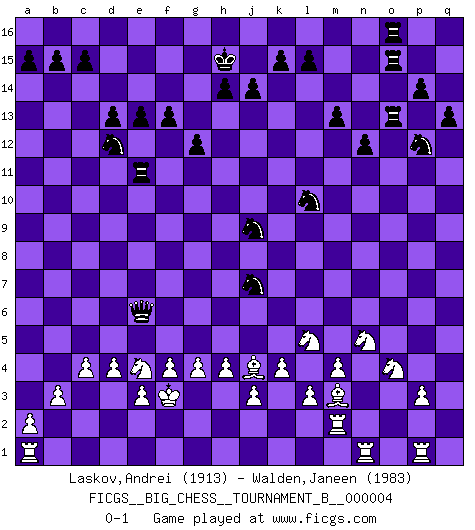 Last move : 0-1 2011 December 7 20:6:45 [Event "FICGS__BIG_CHESS__TOURNAMENT_B__000004"] [Site "FICGS"] [Date "2011.10.23"] [Round "1"] [White "Laskov,Andrei"] [Black "Walden,Janeen"] [Result "0-1"] [WhiteElo "1913"] [BlackElo "1983"] 1.j2-h4 j15-k13 2.h1-o7 h15-g13 3.o7-o15 m15-m13 4.d2-d3 p16-o14 5.c1-o12 h16-m12 6.o12-p11 m12-n11 7.p11-q10 l16-n14 8.q10-o12 n11-n12 9.o15-n14 n12-n14 10.n2-n3 e15-e13 11.b1-c3 f16-c13 12.m2-m4 d15-d13 13.e2-e3 c16-h11 14.l1-m2 b16-c14 15.o1-m3 n14-p12 16.m2-h6 p12-p2 17.p1-n2 p2-o2 18.m1-o1 o2-n3 19.k1-l3 n15-n13 20.l3-m1 n3-n12 21.o12-p13 o16-g9 22.l2-l3 k16-l14 23.g1-j2 m16-o16 24.f1-e2 o14-p12 25.o1-p1 q15-q13 26.k2-k4 o16-o13 27.h2-k3 q16-o16 28.j1-h2 j16-h15 29.m1-k2 g16-j15 30.p1-n1 o16-o15 31.n2-p3 n12-l12 32.e1-l1 e16-o16 33.p3-n4 h11-g10 34.q1-p1 n13-n12 35.p13-k8 k13-j11 36.k2-l4 o13-o3 37.l1-m1 j11-l10 38.k8-p3 g9-j7 39.h6-j5 l10-k8 40.l4-n5 o3-o11 41.k3-l5 o11-b11 42.b2-b3 k8-l6 43.n5-l6 g10-l6 44.c3-e4 c13-e11 45.h4-k3 e11-f12 46.n4-m6 j7-k8 47.l5-k7 l6-k7 48.m6-k7 k8-p3 49.q2-p3 f12-l7 50.k7-l5 l7-j5 51.k3-j5 a16-n16 52.l5-n4 n16-n13 53.j2-l1 n13-o13 54.l1-n2 p15-p14 55.n2-o4 j15-h13 56.h3-h4 l14-k12 57.e2-h5 b11-c11 58.c2-c4 c14-d12 59.n4-l5 f15-f13 60.j5-l4 g13-h11 61.l4-n5 g15-g13 62.g2-g4 h11-j9 63.h2-g3 k12-l10 64.f2-f4 h13-j11 65.m1-m2 j11-k9 66.h5-g6 k9-j7 67.g6-j4 g13-g12 68.d3-d4 c11-e11 69.g3-f3 l12-e6 0-1 Follow this game move after move (download)Not all artists are Chess players, but all Chess players are artists. (Marcel Duchamp) Alles was ich jemals tun will ist Schach spielen. (Robert James Fischer) Por esta medida (el intervalo entre Fischer y sus contemporaneos), yo le considero el mas grande campeón mundial. (Garry Kasparov) L'action d'une oeuvre littéraire se déroule sur un champ de bataille. Les masques et les types du drame moderne correspondent aux pièces du jeu d'échecs. L'intrigue correspond aux coups et aux gambits, c'est à dire aux techniques du jeu telles qu'utilisées et interprétées par les joueurs. Les tactiques et les péripéties [mouvements] correspondent aux coups exécutés par l'adversaire. (Viktor Shklovsky) When you stop learning you start dying. (M. Scott Adams)
