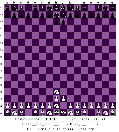 Last move : 1-0 2011 November 23 1:27:45 [Event "FICGS__BIG_CHESS__TOURNAMENT_B__000004"] [Site "FICGS"] [Date "2011.10.23"] [Round "1"] [White "Laskov,Andrei"] [Black "Biryukov,Sergey"] [Result "1-0"] [WhiteElo "1913"] [BlackElo "1627"] 1.j2-h4 1-0 This big chess game has been lost on time (started : 2011.10.23 15:34:24) Follow this game move after move (download)Chess is a fairy tale of 1001 blunders. (Savielly Tartakower) Alles was am Schachbrett zählt sind gute Züge. (Robert James Fischer) Es muy difícil jugar en contra de la teoría de Einstein. - en su primera derrota en contra de Fischer (Mikhail Tal) Les erreurs sont comme les malheurs, elles n'arrivent jamais seules. (Siegbert Tarrasch) To err is human, but to really foul things up requires a computer. (Farmer's Almanac, 1978)