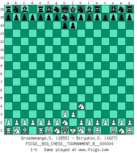 Last move : 1-0 2011 November 24 1:36:45 [Event "FICGS__BIG_CHESS__TOURNAMENT_B__000004"] [Site "FICGS"] [Date "2011.10.23"] [Round "1"] [White "Grosdemange,David"] [Black "Biryukov,Sergey"] [Result "1-0"] [WhiteElo "1855"] [BlackElo "1627"] 1.j2-k4 1-0 This big chess game has been lost on time (started : 2011.10.23 15:34:24) Follow this game move after move (download)The tactician knows what to do when there is something to do; whereas the strategian knows what to do when there is nothing to do. (Gerald Abrahams) Gewöhnliche Menschen denken nur daran, wie sie ihre Zeit verbringen. Ein intelligenter Mensch versucht, sie auszunutzen. (Arthur Schopenhauer) En el Ajedrez, tal como es jugado por los Maestros, practicamente la suerte es eliminada. (Emanuel Lasker) Lorsque vous vous retrouvez devant une position atroce, ne tendez pas un ultime piège dérisoire avec l'intention d'abandonner si l'adversaire le déjoue ! Faites-vous plutôt un devoir de résister comme si votre vie en dépendait. Jouez le coup qui vous déplairait au centuple si vous étiez dans la peau de votre tortionnaire ! It is a good thing for an uneducated man to read books of quotations. (Winston Churchill)