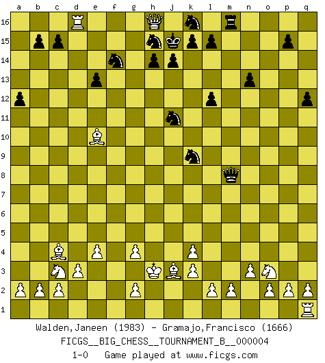 Last move : 1-0 2011 November 5 10:0:21 [Event "FICGS__BIG_CHESS__TOURNAMENT_B__000004"] [Site "FICGS"] [Date "2011.10.23"] [Round "1"] [White "Walden,Janeen"] [Black "Gramajo,Francisco"] [Result "1-0"] [WhiteElo "1983"] [BlackElo "1666"] 1.j2-k4 a15-a13 2.h1-o7 j15-h13 3.o7-o15 q15-q13 4.h2-g4 n15-n14 5.o15-o4 e15-e13 6.e2-e4 q13-q12 7.f1-c4 a13-a12 8.d2-d3 d15-d13 9.c1-k8 b16-c14 10.b1-c3 p16-o14 11.e1-e3 q16-q13 12.p1-o3 q13-o13 13.o4-l7 o13-l13 14.l7-f7 f16-b12 15.k8-n11 m15-m14 16.n11-l13 m14-l13 17.f7-f15 e16-f16 18.f15-d13 b12-k4 19.j3-k4 c16-l8 20.d13-j8 l8-g4 21.h3-g4 f16-f2 22.e3-e2 a16-f16 23.j8-j5 f2-f1 24.a1-f1 f16-f1 25.e2-e1 f1-f4 26.k1-j3 l13-l12 27.g1-h3 o16-f8 28.j5-e5 h16-o10 29.e5-f4 o10-e1 30.j1-j2 e1-m8 31.k2-k3 o14-n12 32.l1-k2 h13-j11 33.m1-f1 f8-g9 34.n2-n3 n14-n13 35.o1-l4 c14-d12 36.f1-f3 n12-m10 37.f4-f15 g16-f14 38.f15-g15 d12-e10 39.l4-e10 g9-e7 40.f3-f7 e7-j3 41.k2-j3 l16-q11 42.f7-d7 q11-h3 43.j2-h3 m10-k9 44.d7-d16 j16-j15 45.g15-h16 1-0 Follow this game move after move (download)The game of Chess is not merely an idle amusement; several very valuable qualities of the mind are to be acquired and strengthened by it, so as to become habits ready on all occasions; for life is a kind of Chess. (Benjamin Franklin) Kasparov ist eine Art Monster mit hundert Augen, denen auch nicht das Geringste entgeht. (Tony Miles) Un buen jugador siempre tiene buena suerte. (José Raúl Capablanca) L'ordinateur a tué l'originalité. Il n'y a plus guère d'aventures sur l'échiquier. (Jacob Murray) Secret operations are essential in war; upon them the army relies to make its every move. (Sun Tzu)