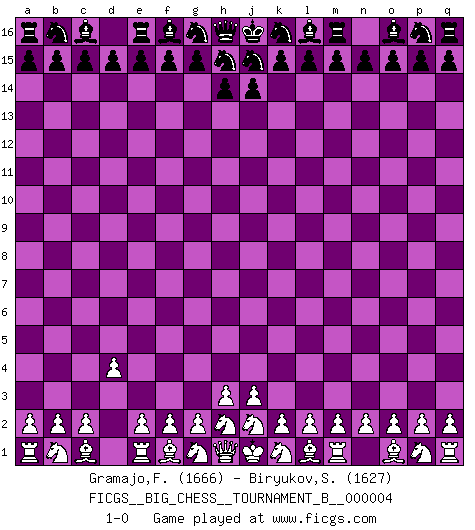 Last move : 1-0 2011 November 23 1:27:45 [Event "FICGS__BIG_CHESS__TOURNAMENT_B__000004"] [Site "FICGS"] [Date "2011.10.23"] [Round "1"] [White "Gramajo,Francisco"] [Black "Biryukov,Sergey"] [Result "1-0"] [WhiteElo "1666"] [BlackElo "1627"] 1.d2-d4 1-0 This big chess game has been lost on time (started : 2011.10.23 15:34:24) Follow this game move after move (download)Every Pawn is a potential Queen. (James Mason) Nur ein wirklich starker Spieler weiß wie schwach er spielt. (Savielly Grigorievitsch Tartakower) Sin errores no puede haber brillantez. (Emanuel Lasker) Vouloir jouer aux échecs contre soi-même est aussi paradoxal que vouloir marcher sur son ombre. (Stefan Zweig) Indecision is the key to flexibility. (Unknown)