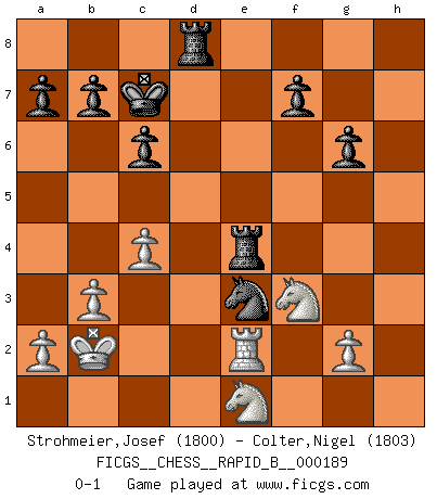 Last move : 0-1 2012 February 9 15:3:53 [Event "FICGS__CHESS__RAPID_B__000189"] [Site "FICGS"] [Date "2011.10.23"] [Round "1"] [White "Strohmeier,Josef"] [Black "Colter,Nigel"] [Result "0-1"] [WhiteElo "1800"] [BlackElo "1803"] 1.e4 c6 2.d4 d5 3.Nc3 dxe4 4.Nxe4 Nf6 5.Ng3 h5 6.h4 Bg4 7.Be2 e6 8.Bg5 Nbd7 9.Qd2 Qc7 10.O-O-O Bd6 11.Bxg4 hxg4 12.N1e2 O-O-O 13.Kb1 Kb8 14.c3 Rde8 15.Bf4 Bxf4 16.Nxf4 e5 17.dxe5 Nxe5 18.Nf5 g6 19.Nd4 Nc4 20.Qc1 Ne4 21.Nd3 g3 22.fxg3 Qxg3 23.b3 Ne3 24.Rh3 Qg4 25.Rxe3 Qxd1 26.Kb2 Qxc1+ 27.Nxc1 Rxh4 28.Nf3 Rg4 29.Re2 Nf6 30.Rd2 Nd5 31.Nd3 Ne3 32.Nde1 Kc7 33.c4 Rd8 34.Re2 Re4 0-1 Caro-Kann defense Queenside Castling by player White (move 10) Queenside Castling by player Black (move 12) Player Black won this chess game. Follow this game move after move (download)No one ever won a game by resigning. (Unknown) Die FIDE ist dabei in die Hände der russischen Mafia zu fallen. (Larry Evans) A través de las casillas del tablero, los Indios explican el movimiento del tiempo y la edad, las influencias mas altas que controlan el mundo y los lazos que vinculan al Ajedrez con el alma humana. (Al-Masudi) Les Echecs, c'est l'art de la guerre sans les charniers, c'est la résurrection des morts tombés au champ d'honneur, l'espoir perpétuel, la suprématie de l'intelligence sur la force, la culture de l'esprit. (F. Szpiner) Those who make the worst use of their time are the first to complain of its brevity. (Jean de la Bruyere)