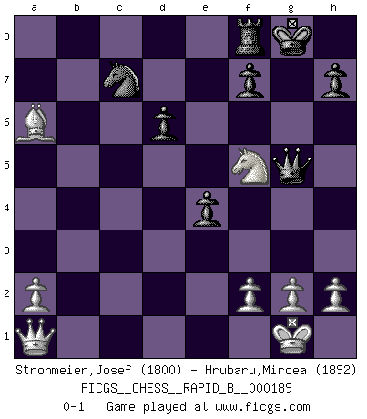 Last move : 0-1 2011 November 23 18:11:1 [Event "FICGS__CHESS__RAPID_B__000189"] [Site "FICGS"] [Date "2011.10.23"] [Round "1"] [White "Strohmeier,Josef"] [Black "Hrubaru,Mircea"] [Result "0-1"] [WhiteElo "1800"] [BlackElo "1892"] 1.e4 c5 2.Nf3 Nc6 3.d4 cxd4 4.Nxd4 Nf6 5.Nc3 e5 6.Ndb5 d6 7.Bg5 a6 8.Bxf6 gxf6 9.Na3 b5 10.Nd5 f5 11.Bd3 Be6 12.c3 Bg7 13.O-O Bxd5 14.exd5 Ne7 15.c4 e4 16.Be2 Bxb2 17.Nc2 Bxa1 18.Qxa1 O-O 19.Nd4 bxc4 20.Bxc4 Rc8 21.Bxa6 Rc7 22.Rc1 Nxd5 23.Nxf5 Qg5 24.Rxc7 Nxc7 0-1 Sicilian : Pelikan (Lasker/Sveshnikov) variation Kingside Castling by player White (move 13) Kingside Castling by player Black (move 18) Player Black won this chess game. Follow this game move after move (download)Only sissies Castle. (Rob Sillars) Ich könnte leicht behaupten: Ja,ja, Leonid Breschnew wollte nicht, daß ich Weltmeister werde. In der Tat war die Sache komplizierter. (Viktor Kortschnoi) Aquel que teme a un Peón de Reina aislado, debería de retirarse del Ajedrez. (Siegbert Tarrasch) Mais l'homme est une créature légère et illogique : semblable au joueur d'échecs, il n'aime que le processus du but à atteindre, non le but lui-même. (Dostoïevsky) Hold em is to stud what chess is to checkers. (Johnny Moss)