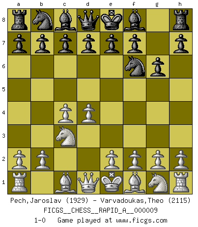 Last move : 1-0 2007 February 9 3:27:32 [Event "FICGS__CHESS__RAPID_A__000009"] [Site "FICGS"] [Date "2007.01.05"] [Round "1"] [White "Pech,Jaroslav"] [Black "Varvadoukas,Theo"] [Result "1-0"] [WhiteElo "1929"] [BlackElo "2115"] 1.d4 Nf6 2.c4 g6 3.Nc3 1-0 This chess game has been lost on time (started : 2007.01.05 11:50:5) King's Indian defense, 3.Nc3 Player White won this chess game. Follow this game move after move (download)Via the squares on the chessboard, the Indians explain the movement of time and the age, the higher influences which control the world and the ties which link Chess with the human soul. (Al-Masudi) Ein Teil des Fehlers ist immer korrekt. (Savielly Grigorievitsch Tartakower) La estratégia requiere pensar, la táctica requiere observación. (Max Euwe) Le profane ne songe pas à la somme de jouissance dont il se prive, qui méconnaît ce jeu aux ressources aussi variées que passionnantes. (Jean-Marie Jeanton-Lamarche) We need strong personalities and only one world champion to attract sponsors. (Anatoly Karpov)