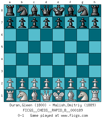 Last move : 0-1 2011 November 23 1:27:45 [Event "FICGS__CHESS__RAPID_B__000189"] [Site "FICGS"] [Date "2011.10.23"] [Round "1"] [White "Duran,Gleen"] [Black "Malish,Dmitriy"] [Result "0-1"] [WhiteElo "1800"] [BlackElo "1889"] 0-1 This chess game has been lost on time (started : 2011.10.23 19:26:44) Player Black won this chess game. Follow this game move after move (download)The King is a fighting piece. Use it ! (Wilhelm Steinitz) Kleine Schachspieler machen Mist, und große Schachspieler machen Mist, aber große machen weniger Mist. (Fritz Sämisch) Cuando veas una buena jugada, trata de encontrar otra mejor. (Emanuel Lasker) A ce moment-là, je menaçais de comprendre la position ! (Clément L'Heureux) Dave, my mind is going. I can feel it. (HAL 9000 in 2001, a space odyssey)