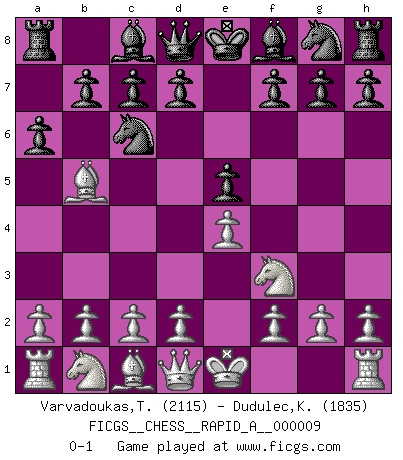 Last move : 0-1 2007 February 8 3:22:47 [Event "FICGS__CHESS__RAPID_A__000009"] [Site "FICGS"] [Date "2007.01.05"] [Round "1"] [White "Varvadoukas,Theo"] [Black "Dudulec,Konstantin"] [Result "0-1"] [WhiteElo "2115"] [BlackElo "1835"] 1.e4 e5 2.Nf3 Nc6 3.Bb5 a6 0-1 This chess game has been lost on time (started : 2007.01.05 11:50:5) Ruy Lopez (Spanish Opening) Player Black won this chess game. Follow this game move after move (download)Nowadays, when you're not a grandmaster at 14, you can forget about it. (Anand Viswanathan) Ich verlor meine Bürgerrechte, mein Gehalt wurde mir nicht mehr bezahlt und ich wurde zensiert und durfte nicht mehr ins Ausland reisen. [nach dem Match Fischer-Taimanov 6:0] (Mark Taimanov) Cualquier cambio de material en una posición debe venir por medio de un mate, una captura o promoción de Peón. (Purdy) Lorsque vous vous retrouvez devant une position atroce, ne tendez pas un ultime piège dérisoire avec l'intention d'abandonner si l'adversaire le déjoue ! Faites-vous plutôt un devoir de résister comme si votre vie en dépendait. Jouez le coup qui vous déplairait au centuple si vous étiez dans la peau de votre tortionnaire ! Sometimes it pays to stay in bed in Monday, rather than spending the rest of the week debugging Monday's code. (Dan Salomon)