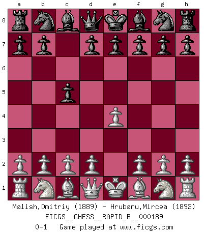 Last move : 0-1 2011 November 24 1:29:58 [Event "FICGS__CHESS__RAPID_B__000189"] [Site "FICGS"] [Date "2011.10.23"] [Round "1"] [White "Malish,Dmitriy"] [Black "Hrubaru,Mircea"] [Result "0-1"] [WhiteElo "1889"] [BlackElo "1892"] 1.e4 c5 0-1 This chess game has been lost on time (started : 2011.10.23 19:26:44) Sicilian defense Player Black won this chess game. Follow this game move after move (download)Any material change in a position must come about by mate, a capture, or a Pawn promotion. (Purdy) Ich brauche nur einen Blick auf das Schachbrett zu werfen, und weiß schon, was in der Stellung steckt, was geschehen kann und was geschehen wird. Alle übrigen suchen und prüfen, ich aber weiß es! (José Raúl Capablanca) Morphy probablemente fue el genio más grande de todos. (Bobby Fischer) Il vaut toujours mieux jouer un plan faux de façon logique que de n'avoir pas de plan du tout. (Victor Kortchnoï) Creativity is inventing, experimenting, growing, taking risks, breaking rules, making mistakes, and having fun. (Mary Lou Cook)