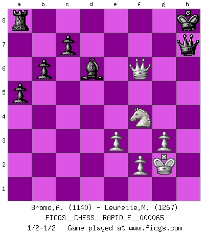 Last move : 1/2-1/2 2011 November 22 19:9:29 [Event "FICGS__CHESS__RAPID_E__000065"] [Site "FICGS"] [Date "2011.10.24"] [Round "1"] [White "Bromo,Alexis"] [Black "Leurette,Marc-Antoine"] [Result "1/2-1/2"] [WhiteElo "1140"] [BlackElo "1267"] 1.d4 d5 2.c4 dxc4 3.Nc3 Nf6 4.Nf3 e6 5.e3 Nc6 6.a3 Be7 7.Bxc4 Na5 8.Ba2 b6 9.b4 Nc6 10.Bb2 Ba6 11.b5 Bxb5 12.Nxb5 a6 13.Nc3 a5 14.Qc2 O-O 15.O-O Bd6 16.Ng5 Bxh2+ 17.Kh1 g6 18.Rad1 Bd6 19.Bxe6 fxe6 20.Nxe6 Qe7 21.Nxf8 Kxf8 22.d5 Nxd5 23.g3 Nf6 24.Ne2 Ne5 25.Bxe5 Qxe5 26.Kg2 Bxa3 27.Nf4 Kg7 28.Rh1 Bd6 29.Rxh7+ Nxh7 30.Qxg6+ Kh8 31.Rh1 Qg7 32.Rxh7+ Qxh7 33.Qf6+ Kg8 34.Qe6+ Qf7 35.Qg4+ Qg7 36.Qe6+ Qf7 37.Qg4+ Kh8 38.Qh4+ Qh7 39.Qf6+ Qg7 40.Qh4+ Qh7 41.Qf6+ 1/2-1/2 Queen's gambit accepted Kingside Castling by player Black (move 14) Kingside Castling by player White (move 15) This chess game ended in a draw. Follow this game move after move (download)The laws of Chess do not permit a free choice: you have to move whether you like it or not. (Emanuel Lasker) Moralische Siege zählen nicht. (Savielly Grigorievitsch Tartakower) Desconfianza es la característica mas necesaria de un jugador de Ajedrez. (Siegbert Tarrasch) Les Echecs ne sont pas pour les âmes timides. Ils requièrent un homme entier, qui ne s'arrête pas aveuglément à ce qui a été déjà établi, mais qui tente individuellement de sonder les profondeurs du jeu. (W. Steinitz) The Movers & Shakers of this world are those who play chess in the mornings and go to the disco in the evenings. (Dinesh De Silva)