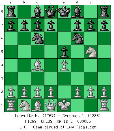 Last move : 1-0 2011 November 30 2:32:36 [Event "FICGS__CHESS__RAPID_E__000065"] [Site "FICGS"] [Date "2011.10.24"] [Round "1"] [White "Leurette,Marc-Antoine"] [Black "Gresham,Jonathan"] [Result "1-0"] [WhiteElo "1267"] [BlackElo "1238"] 1.e4 e5 2.Nf3 Nc6 3.Bc4 Nf6 4.Ng5 1-0 This chess game has been lost on time (started : 2011.10.24 20:37:11) Two knights defense Player White won this chess game. Follow this game move after move (download)It is always better to sacrifice your opponent's men. (Savielly Tartakower) Er war ein guter Schachspieler, aber ich kann Leute nicht ausstehen, die 'Heil Hitler' rufen (Über Alexander Aljechin). (Miguel Najdorf) No hay un Gran Maestro de Ajedrez que sea normal; solo se diferencían ellos por la magnitud de su locura. (Viktor Korchnoi) Votre prénom est 'Tactique', votre deuxième prénom est 'Tactique' et votre nom est 'Tactique'. (Ken Smith) Everybody lies. (Gregory House, House M.D.)