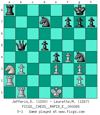 Last move : 0-1 2011 December 1 22:5:33 [Event "FICGS__CHESS__RAPID_E__000065"] [Site "FICGS"] [Date "2011.10.24"] [Round "1"] [White "Jefferis,Des"] [Black "Leurette,Marc-Antoine"] [Result "0-1"] [WhiteElo "1200"] [BlackElo "1267"] 1.d4 d5 2.Bf4 Nf6 3.e3 e6 4.Nf3 Bd6 5.Bg3 Bxg3 6.hxg3 b6 7.Bd3 c5 8.dxc5 bxc5 9.Ne5 c4 10.Be2 Nbd7 11.Nf3 Rb8 12.b3 Ba6 13.Nd4 Qc8 14.O-O cxb3 15.axb3 Bxe2 16.Qxe2 Rb7 17.f3 O-O 18.Na3 Qc5 19.Nab5 Ra8 20.Ra2 a6 21.Na3 a5 22.Kf2 a4 23.Rb1 axb3 24.cxb3 e5 25.Ndb5 e4 26.f4 Rxb5 27.Qxb5 Ng4+ 28.Ke1 Qxb5 0-1 Queen's pawn, Mason variation Kingside Castling by player White (move 14) Kingside Castling by player Black (move 17) Player Black won this chess game. Follow this game move after move (download)Fischer sacrificed virtually everything most of us weakies (to use his term) value, respect, and cherish, for the sake of an artful, often beautiful board game, for the ambivalent privilege of being its greatest master. (Paul Kollar) Wie gewinnt Tal? Er entwickelt alle seine Figuren in die Brettmitte und opfert sie dann irgendwo. (Robert James Fischer) Un sacrificio se refuta mucho mejor al aceptarlo. (Wilhelm Steinitz) Avec des compensations pour le matériel en plus... (Anonyme) Life doesn't imitate art, it imitates bad television. (Woody Allen)