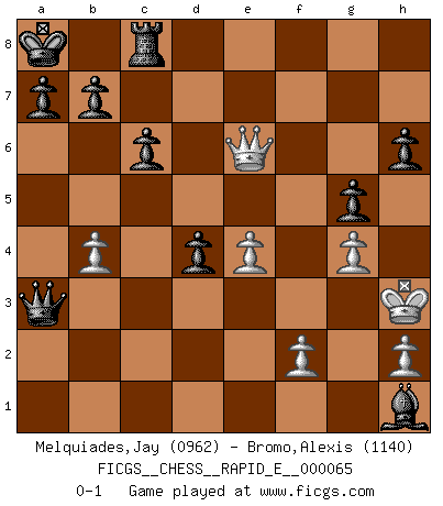 Last move : 0-1 2011 November 8 5:12:38 [Event "FICGS__CHESS__RAPID_E__000065"] [Site "FICGS"] [Date "2011.10.24"] [Round "1"] [White "Melquiades,Jay"] [Black "Bromo,Alexis"] [Result "0-1"] [WhiteElo "0962"] [BlackElo "1140"] 1.e4 e5 2.d3 Nf6 3.Bg5 Be7 4.Nc3 h6 5.Bh4 Nc6 6.Bxf6 Bxf6 7.Nd5 Nd4 8.Nb4 c6 9.Nf3 Qa5 10.c3 Nxf3+ 11.Qxf3 d6 12.Nc2 Be6 13.a3 d5 14.Ne3 d4 15.Nd1 O-O-O 16.g4 g5 17.b4 Qa4 18.Be2 Rhf8 19.Nb2 Qb3 20.Rb1 Qxc3+ 21.Kf1 Ba2 22.Na4 Qxa3 23.Nc5 Bxb1 24.Qf5+ Kb8 25.Nd7+ Rxd7 26.Qxd7 Rd8 27.Qxf7 Bxd3 28.Qxf6 Bxe2+ 29.Kg2 Rc8 30.Qxe5+ Ka8 31.Qe6 Bf3+ 32.Kh3 Bxh1 0-1 Variation Indian Opening : Indian Opening Queenside Castling by player Black (move 15) Player Black won this chess game. Follow this game move after move (download)The essence of Chess is thinking about what Chess is. (David Bronstein) Kasparov ist eine Art Monster mit hundert Augen, denen auch nicht das Geringste entgeht. (Tony Miles) Vive, pierde y aprende al observar a tu oponente como gana. (Amber Steenbock) Aucun coup ne doit être joué sans but. (Pedro Damiano) The beginning is the most important part of the work. (Plato)