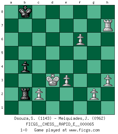 Last move : 1-0 2011 November 30 16:54:51 [Event "FICGS__CHESS__RAPID_E__000065"] [Site "FICGS"] [Date "2011.10.24"] [Round "1"] [White "Dsouza,Stanislaus"] [Black "Melquiades,Jay"] [Result "1-0"] [WhiteElo "1143"] [BlackElo "0962"] 1.d4 d5 2.Nf3 f6 3.Bf4 Nc6 4.e3 e5 5.dxe5 Bg4 6.Be2 fxe5 7.Nxe5 Nxe5 8.Bxe5 Bxe2 9.Qxe2 Bd6 10.Bxd6 Qxd6 11.Nc3 Nf6 12.O-O O-O-O 13.Nb5 Qd7 14.Nxa7+ Kb8 15.Nb5 c6 16.Nc3 Rhf8 17.Qd2 Ne4 18.Nxe4 dxe4 19.Qxd7 Rxd7 20.Rad1 Rdf7 21.Rd2 g5 22.Rd6 g4 23.Rh6 Rd7 24.Re6 Rfd8 25.Rxe4 Rd1 26.Rxg4 R1d2 27.Rc4 c5 28.Rxc5 Rd1 29.h3 b6 30.Rh5 Rxf1+ 31.Kxf1 Rd1+ 32.Ke2 Ra1 33.Rxh7 Rxa2 34.f4 Rxb2 35.Kd3 b5 36.f5 b4 37.f6 1-0 Queen's pawn game Kingside Castling by player White (move 12) Queenside Castling by player Black (move 12) 10 pieces endgame at move 34 : White KRPPPPP , Black KRP WHITE : King + 1 Rook 5 Pawns BLACK : King + 1 Rook 1 Pawn Player White won this chess game. Follow this game move after move (download)I won't play with you anymore. You have insulted my friend. - When an opponent cursed himself for a blunder. (Miguel Najdorf) Karpov ist ein Museumsstück. (Garry Kasparov) Yo no creo en la psicología. Yo creo en las buenas movidas. (Bobby Fischer) Même si vous avez un bon coup à faire, regardez toujours s'il n'y en a pas un qui lui soit préférable. (Pedro Damiano) Begin at the beginning and go on till you come to the end; then stop. (Lewis Carrol, Alice in Wonderland)