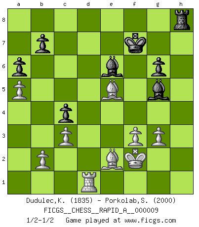 Last move : 1/2-1/2 2007 February 23 22:59:46 [Event "FICGS__CHESS__RAPID_A__000009"] [Site "FICGS"] [Date "2007.01.05"] [Round "1"] [White "Dudulec,Konstantin"] [Black "Porkolab,Sandor"] [Result "1/2-1/2"] [WhiteElo "1835"] [BlackElo "2000"] 1.e4 c5 2.Nf3 d6 3.d4 cxd4 4.Nxd4 Nf6 5.Nc3 a6 6.Be2 e5 7.Nb3 Be7 8.O-O O-O 9.Be3 Be6 10.Qd2 Nbd7 11.a4 Rc8 12.a5 Nc5 13.Nxc5 dxc5 14.Qxd8 Rfxd8 15.f3 c4 16.Na4 Nd7 17.Rfd1 f5 18.exf5 Bxf5 19.c3 Be6 20.Nb6 Nxb6 21.Bxb6 Rxd1+ 22.Rxd1 Kf7 23.Kf2 g6 24.Ke3 Bg5+ 25.Kf2 h5 26.g3 h4 27.Kg2 Rh8 28.Bc7 hxg3 29.hxg3 Bh3+ 30.Kf2 Be6 31.Bxe5 1/2-1/2 Sicilian : Najdorf, Opovcensky variation Kingside Castling by player White (move 8) Kingside Castling by player Black (move 8) This chess game ended in a draw. Follow this game move after move (download)Kasparov : J'adoube , Ivanchuk : S'il vous plaît ! (Garry Kasparov & Vassily Ivanchuk, Linares 1997) Ich würde die 30 stärksten Spieler der USA im Simultanspiel besiegen. (José Raúl Capablanca) En posiciones complicadas, Bobby Fischer pocas veces tuvo que temer de cualquiera. (Paul Keres) Ce qui est bien, c'est d'avoir tout un tas de pièces en prise : l'adversaire ne peut en prendre qu'une à la fois. Cité par Thierry Audin. I don't diet. I just don't eat as much as I'd like to. (Linda Evangelista, supermodel)