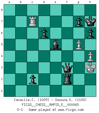 Last move : 0-1 2011 December 9 21:12:5 [Event "FICGS__CHESS__RAPID_E__000065"] [Site "FICGS"] [Date "2011.10.24"] [Round "1"] [White "Cavaille,Cedric"] [Black "Dsouza,Stanislaus"] [Result "0-1"] [WhiteElo "1009"] [BlackElo "1143"] 1.e4 e5 2.Nf3 Nc6 3.Bc4 d6 4.d4 exd4 5.Nxd4 Nf6 6.Nxc6 bxc6 7.Nc3 Be7 8.a3 Be6 9.Bxe6 fxe6 10.b4 O-O 11.O-O e5 12.b5 cxb5 13.Nxb5 Nxe4 14.f3 Nc5 15.a4 c6 16.Nc3 Qc7 17.Ne4 Nxe4 18.fxe4 Rxf1+ 19.Qxf1 Rf8 20.Qc4+ Kh8 21.a5 Rc8 22.a6 Qb6+ 23.Kh1 h6 24.h3 Qf2 25.Qe6 Qf8 26.Ba3 c5 27.Qf5 Qxf5 28.exf5 Bf6 29.Rd1 Rc6 30.g4 Rxa6 31.Bb2 Ra2 32.Bc1 Rxc2 33.Be3 a5 34.Ra1 Re2 35.Bg1 e4 36.Ra3 Re1 37.Rxa5 Bd4 38.Ra8+ Kh7 39.Ra7 Rxg1+ 40.Kh2 Re1 41.f6 Bxf6 42.Rd7 Be5+ 43.Kg2 c4 44.Kf2 Rd1 45.Re7 c3 46.Rc7 Rd2+ 47.Ke1 e3 48.h4 Bg3+ 49.Kf1 c2 50.Kg1 e2 51.Kg2 Be5 52.g5 e1Q 53.Kf3 Rf2+ 54.Kg4 Qd1+ 55.Kh3 Qf3+ 0-1 King's pawn game Kingside Castling by player Black (move 10) Kingside Castling by player White (move 11) Promotion Queen by player Black (move 52) Player Black won this chess game. Follow this game move after move (download)Chess is a more highly symbolic game, but the aggressions are therefore even more frankly represented in the play. It probably began as a war game; that is, the representation of a miniature battle between the forces of two kingdoms. (Karl Meninger) Frage: Was machen Sie mit den Preisen? Anwort: Ich habe Angst, dass meine Freundin davon neue Kleider kauft. (Loek van Wely) Después de una mala apertura, hay una esperanza en el juego medio. Pero una vez que estas en finales, el momento de la verdad ha llegado. (Edmar Mednis) Vouloir jouer aux échecs contre soi-même est aussi paradoxal que vouloir marcher sur son ombre. (Stefan Zweig) A government big enough to give you everything you want is strong enough to take everything you have. (Thomas Jefferson)