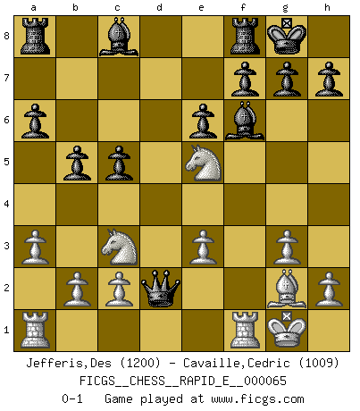 Last move : 0-1 2011 October 25 21:33:42 [Event "FICGS__CHESS__RAPID_E__000065"] [Site "FICGS"] [Date "2011.10.24"] [Round "1"] [White "Jefferis,Des"] [Black "Cavaille,Cedric"] [Result "0-1"] [WhiteElo "1200"] [BlackElo "1009"] 1.e4 c5 2.Nf3 d6 3.g3 Nf6 4.d3 e6 5.Bg2 Be7 6.O-O O-O 7.Nc3 a6 8.Be3 b5 9.a3 Ng4 10.Qd2 Nxe3 11.fxe3 Nd7 12.d4 Bf6 13.e5 dxe5 14.dxe5 Nxe5 15.Nxe5 Qxd2 0-1 Sicilian Kingside Castling by player White (move 6) Kingside Castling by player Black (move 6) Player Black won this chess game. Follow this game move after move (download)Fischer, who may or may not be mad as a hatter, has every right to be horrified. (Jeremy Silman) Die Leute spielen gegen mich seit 15 Jahren unter Ihren Möglichkeiten. (Robert James Fischer) Si no le temes a Spassky, entonces elimino el elemento del dinero. (Jim Slater) Les échecs, c'est l'imagination. (David Bronstein) Home computers are being called upon to perform many new functions, including the consumption of homework formerly eaten by the dog. (Doug Larson)