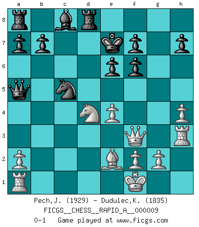 Last move : 0-1 2007 March 2 6:14:12 [Event "FICGS__CHESS__RAPID_A__000009"] [Site "FICGS"] [Date "2007.01.05"] [Round "1"] [White "Pech,Jaroslav"] [Black "Dudulec,Konstantin"] [Result "0-1"] [WhiteElo "1929"] [BlackElo "1835"] 1.d4 Nf6 2.c4 e6 3.Nf3 d5 4.Nc3 Bb4 5.Bg5 dxc4 6.e4 c5 7.Bxc4 cxd4 8.Nxd4 Bxc3+ 9.bxc3 Qa5 10.Bb5+ Nbd7 11.Bxf6 Qxc3+ 12.Kf1 gxf6 13.h4 Qa5 14.Qf3 Ke7 15.Rh3 Rd8 16.Be2 Nc5 0-1 This chess game has been lost on time (started : 2007.01.05 11:50:5) Queen's pawn game Player Black won this chess game. Follow this game move after move (download)A bad plan is better than none at all. (Frank Marshall) Schach ist wie eine schöne Frau, zu der wir ständig zurückkehren, gleichviel, wie oft sie uns zurückweist. (Anonymous) La única cosa que los jugadores de Ajedrez tienen en común, es el Ajedrez. (Lodewijk Prins) Vouloir jouer aux échecs contre soi-même est aussi paradoxal que vouloir marcher sur son ombre. (Stefan Zweig) Always remember that you are unique; just like everyone else. (Unknown)
