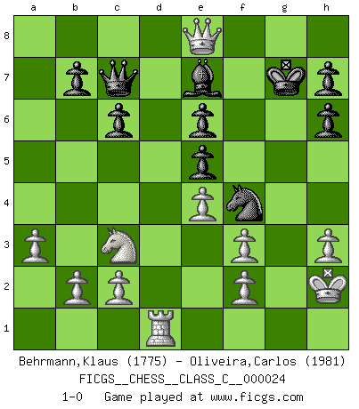 Last move : 1-0 2007 February 23 20:44:26 [Event "FICGS__CHESS__CLASS_C__000024"] [Site "FICGS"] [Date "2007.01.07"] [Round "1"] [White "Behrmann,Klaus"] [Black "Oliveira,Carlos"] [Result "1-0"] [WhiteElo "1775"] [BlackElo "1981"] 1.e4 c6 2.d4 d6 3.Nf3 Qc7 4.Bc4 e5 5.Ng5 Nh6 6.O-O Be7 7.h3 O-O 8.Nf3 Be6 9.Bxe6 fxe6 10.Bxh6 gxh6 11.dxe5 dxe5 12.Nc3 Nd7 13.Qe2 Rad8 14.Rad1 Nf6 15.Qe3 Kg7 16.Qxa7 Nh5 17.a3 Rxf3 18.Rxd8 Bxd8 19.gxf3 Nf4 20.Kh2 Kh8 21.Qa8 Kg7 22.Rd1 Be7 23.Qe8 1-0 Caro-Kann defense Kingside Castling by player White (move 6) Kingside Castling by player Black (move 7) Player White won this chess game. Follow this game move after move (download)I feel as if I were a piece in a game of Chess, when my opponent says of it: That piece cannot be moved. (Soren Kierkegaard) Wenn du auf das Glück wartest, wird das Leben ziemlich langweilig. (Mikhail Nekhemyevich Tal) Los finales de Peón son del Ajedrez lo que el cesped es del Golf. (Cecil Purdy) Toute estimation doit être constamment réévaluée. (Jacob Estrin) The age of a woman doesn't mean a thing. The best tunes are played on the oldest fiddles. (Ralph Waldo Emerson)
