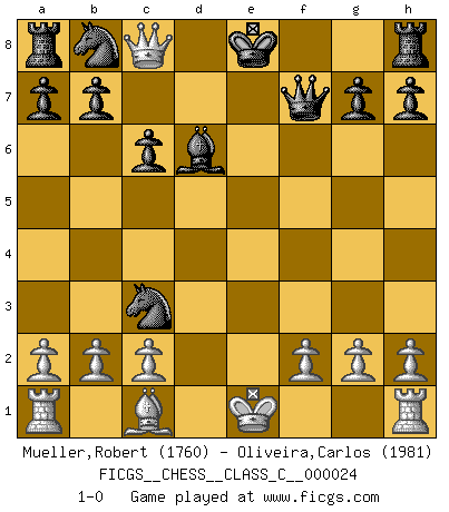 Last move : 1-0 2007 February 6 6:8:25 [Event "FICGS__CHESS__CLASS_C__000024"] [Site "FICGS"] [Date "2007.01.07"] [Round "1"] [White "Mueller,Robert"] [Black "Oliveira,Carlos"] [Result "1-0"] [WhiteElo "1760"] [BlackElo "1981"] 1.e4 c6 2.Nf3 d6 3.d4 Qc7 4.Nc3 e5 5.Bc4 Be6 6.Bxe6 fxe6 7.Ng5 exd4 8.Nxe6 Qf7 9.Nxd4 Nf6 10.Nf5 Nxe4 11.Qg4 Nxc3 12.Nxd6+ Bxd6 13.Qc8+ 1-0 Caro-Kann defense Player White won this chess game. Follow this game move after move (download)The battle for the ultimate truth will never be won. And that's why Chess is so fascinating. (Hans Kmoch) Ich glaube, ich kenne inzwischen die Gründe für mein Versagen: schachliche Charakterfehler. Ich war nie ein Wunderkind und in meiner gesamten menschlichen Entwicklung immer zu langsam. (Viktor Kortschnoi) Fischer es el jugador mas fuerte del mundo. De hecho, el jugador mas fuerte que jamas haya existido. (Larry Evans) Karpov est une pièce de musée. (Garry Kasparov) Luck never made a man wise. (Seneca, Letters to Lucilius)
