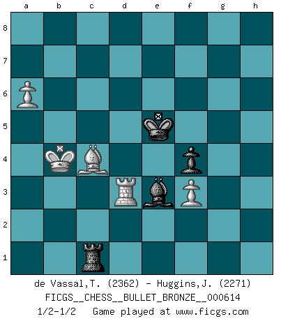 Last move : 1/2-1/2 2011 November 1 22:28:0 [Event "FICGS__CHESS__BULLET_BRONZE__000614"] [Site "FICGS"] [Date "2011.11.01"] [Round "1"] [White "de Vassal,Thibault"] [Black "Huggins,Jimmy"] [Result "1/2-1/2"] [WhiteElo "2362"] [BlackElo "2271"] 1.e4 c5 2.Nf3 d6 3.d4 cxd4 4.Nxd4 Nf6 5.Nc3 a6 6.Be2 e5 7.Nb3 Be7 8.O-O O-O 9.Be3 h6 10.Qd3 Nc6 11.Bf3 Qc7 12.a3 Nd8 13.Nd2 Ne6 14.Nc4 Nf4 15.Bxf4 exf4 16.Qd4 Be6 17.Nb6 Rad8 18.Rfe1 Rfe8 19.Re2 Bf8 20.Rae1 g5 21.Nbd5 Bxd5 22.Nxd5 Nxd5 23.Qxd5 Re5 24.Qd1 Rde8 25.c3 Qc4 26.Qc2 b5 27.h3 Qe6 28.Rc1 a5 29.Rd2 Qg6 30.Rd4 Kg7 31.Qd2 h5 32.Qd1 g4 33.hxg4 hxg4 34.Bxg4 Rxe4 35.Bf3 Rxd4 36.Qxd4+ Qf6 37.Qb6 Be7 38.Qxb5 Rh8 39.Re1 Qh4 40.Kf1 Rh6 41.Qf5 Qh1+ 42.Ke2 Re6+ 43.Be4 Qh4 44.Kd1 Re5 45.Qh3 Qxh3 46.gxh3 Bh4 47.Rg1+ Kf8 48.f3 d5 49.Bd3 Rh5 50.Bf1 Bg3 51.a4 d4 52.b4 dxc3 53.bxa5 Rxa5 54.Bb5 Bf2 55.Rg4 Be3 56.h4 Ra8 57.h5 Ke7 58.Rg2 Rh8 59.Rh2 Bg1 60.Rh1 Rg8 61.Kc2 Bd4 62.Rh2 Kf6 63.h6 Rb8 64.h7 Kg7 65.Rh5 f5 66.Rxf5 Kxh7 67.a5 Kg7 68.Rd5 Be3 69.Kxc3 Kf6 70.Kb4 Ke6 71.Rd1 Kf5 72.a6 Ke5 73.Kc4 Rc8+ 74.Kb3 Ra8 75.Ka4 Rc8 76.Rd7 Ke6 77.Ka5 Rc3 78.Kb4 Rc1 79.Rd3 Ke5 80.Bc4 1/2-1/2 Sicilian : Najdorf, Opovcensky variation Kingside Castling by player White (move 8) Kingside Castling by player Black (move 8) 10 pieces endgame at move 66 : White KRBPP , Black KRBPP WHITE : King + 1 Rook 1 Bishop 2 Pawns BLACK : King + 1 Rook 1 Bishop 2 Pawns 9 pieces endgame at move 69 : White KRBPP , Black KRBP WHITE : King + 1 Rook 1 Bishop 2 Pawns BLACK : King + 1 Rook 1 Bishop 1 Pawn This chess game ended in a draw. Follow this game move after move (download)I like to say that Bobby Fischer was the greatest player ever. But what made Fischer a genius was his ability to blend an American freshness and pragmatism with Russian ideas about strategy. (Bruce Pandolfini) Vom Schach wurde gesagt das Leben sei dafür nicht lange genug. Aber das ist der Fehler des Lebens, nicht des Schach'. (Irving Chernev) Alekhine es un poeta que crea un trabajo de arte de algo que raramente inspiraría a otra persona a mandar una tarjeta postal. (Max Euwe) Le moment que je préfère le plus dans une rencontre, c'est celui où je sens que la personnalité de l'adversaire se brise. (Robert Fischer) Programming can only do so much before it becomes too much. (Don Groves)