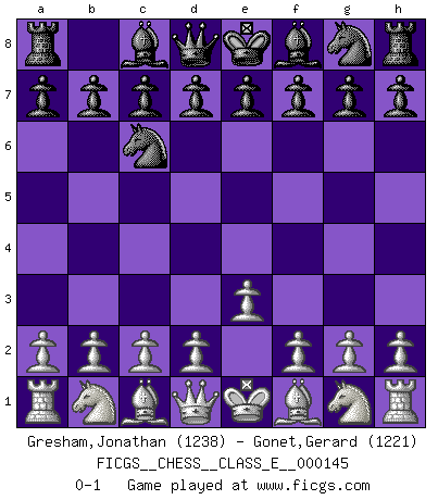 Last move : 0-1 2011 December 13 4:18:48 [Event "FICGS__CHESS__CLASS_E__000145"] [Site "FICGS"] [Date "2011.11.02"] [Round "1"] [White "Gresham,Jonathan"] [Black "Gonet,Gerard"] [Result "0-1"] [WhiteElo "1238"] [BlackElo "1221"] 1.e3 Nc6 0-1 This chess game has been lost on time (started : 2011.11.02 16:22:37) Van't Kruijs Opening Player Black won this chess game. Follow this game move after move (download)He who takes the Queen's Knight's Pawn will sleep in the streets. (Anonymous) Obendrein hat der FIDE-Präsident den Revolutionsführer Gaddafi zum »Großmeister« ernannt, am Ende der WM. Das ist lächerlich! (Joel Lautier) Dios mío, Bobby Fischer juega tan simple. (Alexei Suetin) Il (Jacob Murray) ne joue pas pour le bon coup, mais pour le meilleur. (Eloi Relange) He who is a good ruler must first have been ruled. (Aristotle)