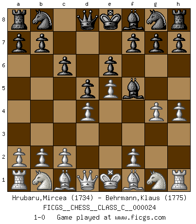 Last move : 1-0 2007 January 18 1:22:54 [Event "FICGS__CHESS__CLASS_C__000024"] [Site "FICGS"] [Date "2007.01.07"] [Round "1"] [White "Hrubaru,Mircea"] [Black "Behrmann,Klaus"] [Result "1-0"] [WhiteElo "1734"] [BlackElo "1775"] 1.e4 c6 2.d4 d5 3.e5 Bf5 4.h4 e6 5.g4 1-0 Caro-Kann : Advance variation Player White won this chess game. Follow this game move after move (download)Fischer sacrificed virtually everything most of us weakies (to use his term) value, respect, and cherish, for the sake of an artful, often beautiful board game, for the ambivalent privilege of being its greatest master. (Paul Kollar) Wie gewinnt Tal? Er entwickelt alle seine Figuren in die Brettmitte und opfert sie dann irgendwo. (Robert James Fischer) No es suficiente ser un buen jugador, se debe también de jugar bién. (Siegbert Tarrasch) Le jeu d'échecs fait naître et fortifie en nous plusieurs qualités précieuses dans le cours de l'existence, telles que la prévoyance, la circonspection, la prudence, et la persévérance. (Benjamin Franklin - 1783, la morale des échecs) Over-the-board chess is the favorite of mortals, correspondence chess is the favorite of the gods. (Eduard Dyckhoff)
