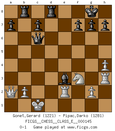 Last move : 0-1 2011 November 16 13:45:24 [Event "FICGS__CHESS__CLASS_E__000145"] [Site "FICGS"] [Date "2011.11.02"] [Round "1"] [White "Gonet,Gerard"] [Black "Pipac,Darko"] [Result "0-1"] [WhiteElo "1221"] [BlackElo "1281"] 1.d4 d5 2.e4 dxe4 3.Nc3 Nc6 4.d5 Nb4 5.Bf4 Nf6 6.Bc4 e6 7.Bg5 exd5 8.Bxf6 Qxf6 9.a3 Nxc2+ 10.Qxc2 dxc4 11.O-O-O Bf5 12.h4 e3 13.Ne4 Bxe4 14.Qxe4+ Be7 15.Qxb7 O-O 16.Qe4 exf2 17.Nf3 Rfe8 18.Qxc4 Rab8 19.Rd2 Red8 20.Rxf2 Bxa3 21.Qa2 Bc5 22.Re2 Qc6 23.Rh3 Be3+ 0-1 Blackmar gambit Queenside Castling by player White (move 11) Kingside Castling by player Black (move 15) Player Black won this chess game. Follow this game move after move (download)The stomach is an essential part of the Chess master. (Bent Larsen) Deine Wertungszahl - vorausgesetzt einige Jahre schachliche Anstrengung - entspricht etwa dem zehnfachen Deines IQ plus 1000. (Jonathan Levitt) Todo lo que importa ante el tablero de Ajedrez son buenas jugadas. (Bobby Fischer) Il n'y a pas eu de défaite parce que je ne crois pas que cet ordinateur ait jamais existé. IBM a triché en refusant d'imprimer les modes de recherche de la machine. C'est évident, pendant le match, des coups décisifs ont été joués par des êtres humains. Aujourd'hui, les meilleurs spécialistes en informatique ne peuvent toujours pas expliquer comment Deep-Blue a pu jouer contre la logique des ordinateurs. IBM a gagné une guerre de communication, mais ils sont incapables de prouver que l'ordinateur a gagné tout seul. (Garry Kasparov) Rules and bones are meant to be broken. (Anonymous)