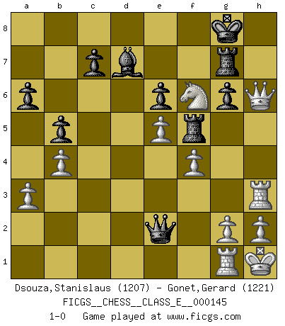 Last move : 1-0 2011 November 16 13:48:46 [Event "FICGS__CHESS__CLASS_E__000145"] [Site "FICGS"] [Date "2011.11.02"] [Round "1"] [White "Dsouza,Stanislaus"] [Black "Gonet,Gerard"] [Result "1-0"] [WhiteElo "1207"] [BlackElo "1221"] 1.e4 Nc6 2.d4 d5 3.f3 e6 4.Nc3 Bb4 5.Bd3 Nf6 6.Bd2 O-O 7.Nge2 a6 8.e5 Ne8 9.Na4 Be7 10.O-O Bd7 11.f4 f6 12.b3 fxe5 13.dxe5 b5 14.Nb2 Bc5+ 15.Kh1 Nb4 16.Bxb4 Bxb4 17.a3 Bc5 18.b4 Bb6 19.Ng3 Be3 20.Qh5 g6 21.Qh6 Ng7 22.Rf3 d4 23.R3f1 Qe7 24.Rae1 Qf7 25.Ne2 Nf5 26.Bxf5 Qxf5 27.Nd1 Qxc2 28.Nxe3 dxe3 29.Nd4 Qb2 30.Nf3 Rf7 31.Rxe3 Rd8 32.Ng5 Rg7 33.Rh3 Qe2 34.Rg1 Rf8 35.Nxh7 Rf5 36.Nf6+ 1-0 KP : Nimzovich defense Kingside Castling by player Black (move 6) Kingside Castling by player White (move 10) Player White won this chess game. Follow this game move after move (download)Robert Fischer is a law unto himself. (Larry Evans) Ein bischen Romantik kann weder im Schach noch in der Liebe schaden. Also versuche ich mich ab und zu daran zu erinnern. (Nigel Short) Aquellos que dicen entender al Ajedrez, no entienden nada. (Robert Hubner) Si je n'étais pas joueur d'échecs, je serais le meilleur dans quelque chose d'autre. (Anatoli Karpov) Information on the Internet is subject to the same rules and regulations as conversation at a bar. (George Lundberg)
