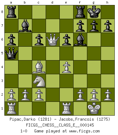Last move : 1-0 2011 December 20 14:48:16 [Event "FICGS__CHESS__CLASS_E__000145"] [Site "FICGS"] [Date "2011.11.02"] [Round "1"] [White "Pipac,Darko"] [Black "Jacobs,Francois"] [Result "1-0"] [WhiteElo "1281"] [BlackElo "1275"] 1.e4 c5 2.Nf3 e6 3.Bb5 a6 4.Bc4 Nc6 5.Nc3 d6 6.d4 cxd4 7.Nxd4 Nf6 8.Bg5 Be7 9.O-O O-O 10.Nxc6 bxc6 11.Re1 Qb6 12.Na4 Qa5 13.Bxf6 Bxf6 14.Nc3 Bb7 15.Qxd6 1-0 Sicilian defense Kingside Castling by player White (move 9) Kingside Castling by player Black (move 9) Player White won this chess game. Follow this game move after move (download)When you see a good move, look for a better one. (Emanuel Lasker) Man wirke der falschen Auffassung entgegen, als ob jeder Zug Unmittelbares zu leisten habe; auch Werte- und Ruhezüge haben ihre Existenzberechtigung. (Aaron Nimzowitsch) El Ajedrez es parte de la cultura, y si una cultura esta en decadencia, entonces también el Ajedrez declinará. (Mikhail Botvinnik) On est toujours la mazette de quelqu'un d'autre. (Anonyme) Luck is when opportunity knocks and you answer. (Anonymous)