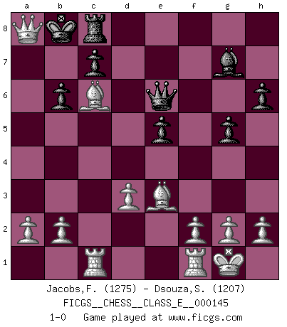 Last move : 1-0 2011 December 30 23:0:49 [Event "FICGS__CHESS__CLASS_E__000145"] [Site "FICGS"] [Date "2011.11.02"] [Round "1"] [White "Jacobs,Francois"] [Black "Dsouza,Stanislaus"] [Result "1-0"] [WhiteElo "1275"] [BlackElo "1207"] 1.Nf3 d5 2.c4 dxc4 3.e3 Nf6 4.Bxc4 h6 5.Nc3 Bf5 6.Qb3 b6 7.Bxf7+ Kd7 8.e4 Nxe4 9.Nxe4 Kc8 10.Nc3 Nc6 11.Be6+ Kb7 12.Bxf5 g5 13.Be4 Qd6 14.O-O Rd8 15.Nb5 Qf6 16.d3 Kb8 17.Be3 Bg7 18.Nbd4 Nxd4 19.Nxd4 Rxd4 20.Bxd4 e5 21.Be3 Rd8 22.Qa4 Qe6 23.Rac1 Rc8 24.Bc6 a5 25.Qb5 Ka7 26.Qxa5+ Kb8 27.Qa8+ 1-0 Reti accepted Kingside Castling by player White (move 14) Player White won this chess game. Follow this game move after move (download)Suddenly it was obvious to me in my analysis I had missed what Fischer had found with the greatest of ease at the board. (Mikhail Botvinnik) Die größte Kunst beim Schach besteht darin dem Gegner nicht zu zeigen was er tun kann. (Garry Kasparov) Si tu oponente no puede hacer nada activo, entonces no apures la posición; En vez de eso, dejalo estar sentado ahí, sufriendo y rogandote por un empate. (Jeremy Silman) La tactique est l'élément le plus important du milieu de jeu. (Siegbert Tarrasch) The intuitive mind is a sacred gift; the rational mind is a faithful servant. We have created a society that honors the servant but has forgotten the gift. (Albert Einstein)