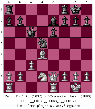 Last move : 1-0 2012 February 5 17:58:32 [Event "FICGS__CHESS__CLASS_B__000160"] [Site "FICGS"] [Date "2011.11.02"] [Round "1"] [White "Panov,Dmitriy"] [Black "Strohmeier,Josef"] [Result "1-0"] [WhiteElo "2037"] [BlackElo "1800"] 1.e4 c5 2.c3 d5 3.exd5 Qxd5 4.d4 Nf6 5.Nf3 Bg4 6.Be2 e6 7.O-O Nc6 8.Be3 cxd4 9.Nxd4 Bxe2 10.Qxe2 Be7 11.Nd2 O-O 12.Nxc6 Qxc6 13.Rfe1 Nd5 14.Bd4 1-0 Sicilian : Alapin's variation (2.c3) Kingside Castling by player White (move 7) Kingside Castling by player Black (move 11) Player White won this chess game. Follow this game move after move (download)One bad move nullifies forty good ones. (Horowitz) Sitze auf Deine Hände. (Siegbert Tarrasch) El Ajedrez es un invernadero donde los frutos del carácter pueden madurar mas completamente que en la vida. (Edward Morgan Foster) La tactique, c'est ce que vous faites quand il y a quelque chose à faire; la stratégie, c'est ce que vous faites quand il n'y a rien à faire. (Savielli Tartacower) It is not enough to be a good player... you must also play well. (Siegbert Tarrasch)
