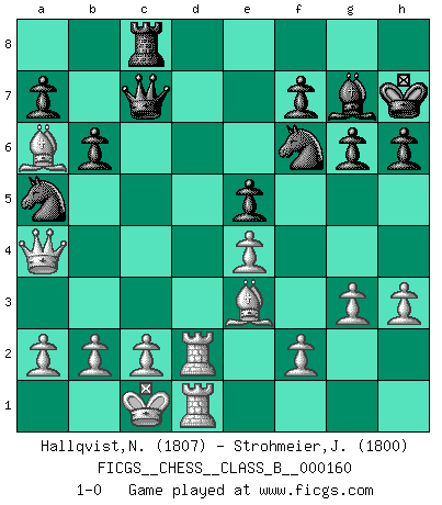 Last move : 1-0 2012 February 5 17:59:6 [Event "FICGS__CHESS__CLASS_B__000160"] [Site "FICGS"] [Date "2011.11.02"] [Round "1"] [White "Hallqvist,Niklas"] [Black "Strohmeier,Josef"] [Result "1-0"] [WhiteElo "1807"] [BlackElo "1800"] 1.d4 Nf6 2.g3 g6 3.Bg2 Bg7 4.e4 d6 5.Ne2 O-O 6.Nbc3 c6 7.Bg5 h6 8.Be3 Nbd7 9.Qc1 Kh7 10.h3 e5 11.dxe5 dxe5 12.Qd2 Qe7 13.O-O-O b6 14.Qd6 Re8 15.Qxc6 Ba6 16.Rhe1 Rac8 17.Qa4 Bxe2 18.Rxe2 Nb8 19.Nb5 Nc6 20.Nd6 Red8 21.Nxc8 Rxc8 22.Red2 Na5 23.Bf1 Qc7 24.Ba6 1-0 Queen's pawn game Kingside Castling by player Black (move 5) Queenside Castling by player White (move 13) Player White won this chess game. Follow this game move after move (download)It is no time to be playing Chess when the house is on fire. (Italian Proverb) Die Partien sind immer verschieden, die Interviews immer die gleichen. (Garry Kasparov) El Ajedrez es un cuento de Hadas de las 1001 metidas de pata. (Savielly Tartakower) Ce qui caractérise les parties de combat, c'est que si le défenseur a constamment de difficiles problèmes à résoudre, l'attaquant doit chercher sans relâche de nouvelles possibilités d'attaque. (Koblentz) The next best thing to gambling and winning is gambling and loosing. (Nick Dandalos)