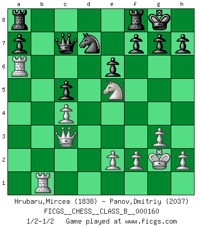 Last move : 1/2-1/2 2012 January 7 0:9:2 [Event "FICGS__CHESS__CLASS_B__000160"] [Site "FICGS"] [Date "2011.11.02"] [Round "1"] [White "Hrubaru,Mircea"] [Black "Panov,Dmitriy"] [Result "1/2-1/2"] [WhiteElo "1838"] [BlackElo "2037"] 1.d4 Nf6 2.c4 e6 3.Nf3 Bb4+ 4.Nc3 O-O 5.Qc2 c5 6.dxc5 Na6 7.c6 bxc6 8.g3 d5 9.Bg2 d4 10.a3 Ba5 11.b4 Nxb4 12.axb4 Bxb4 13.Bd2 dxc3 14.Bxc3 Bxc3+ 15.Qxc3 Bb7 16.Ne5 Qe7 17.O-O c5 18.Rfb1 Bxg2 19.Kxg2 Qc7 20.Ra6 Nd7 1/2-1/2 Bogo-Indian defense Kingside Castling by player Black (move 4) Kingside Castling by player White (move 17) This chess game ended in a draw. Follow this game move after move (download)We don't really know how the game was invented, though there are suspicions. As soon as we discover the culprits, we'll let you know. (Bruce Pandolfini) Um dein Spiel zu verbessern musst du zuallererst das Endspiel studieren, denn diese kann unabhängig studiert werden. Die Eröffnung und das Mittelspiel müssen immer in Bezug gesetzt werden zum Endspiel. (José Raúl Capablanca) No todos los artistas son jugadores de Ajedrez, pero todos los jugadores de Ajedrez son artistas. (Marcel Duchamp) Un millionnaire : 'Monsieur Steinitz ! Vous ne participez aux tournois que pour l'argent, alors que moi je n'y viens que pour l'honneur.' Steinitz : 'Chacun joue pour ce qu'il n'a pas'... Have no fear of perfection - you'll never reach it. (Salvador Dali)